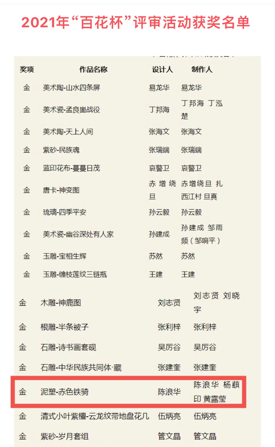 3月31日至4月6日,中国工艺美术协会公示了2021年“百花杯”评审活动获奖情况,我校艺术设计与文化传媒学院陈浪华、黄露莹两位老师的作品《泥塑·赤色铁骑》荣获金奖。