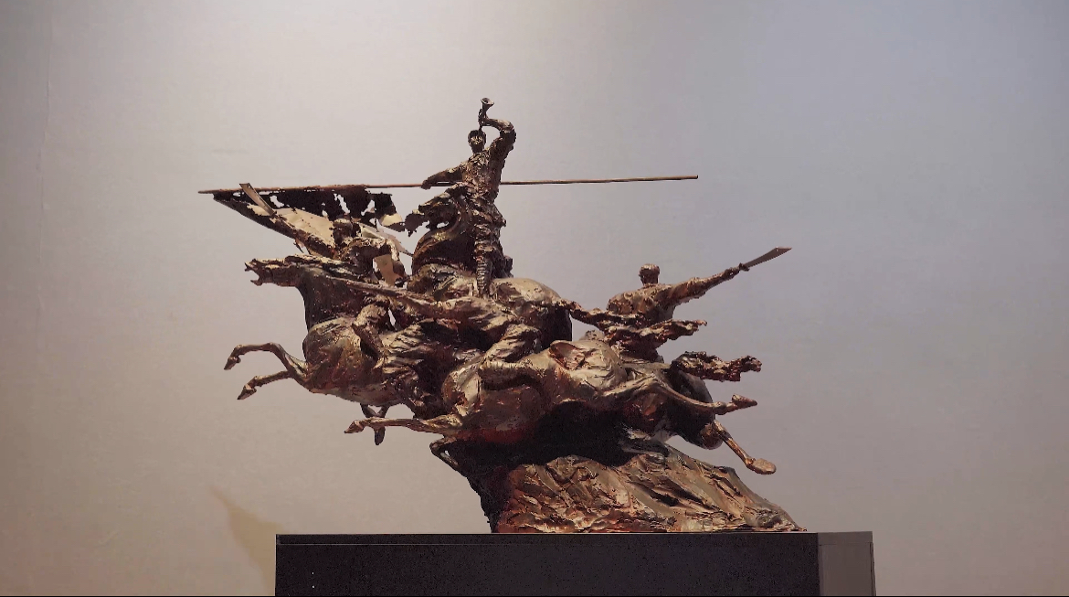 作品《泥塑·赤色铁骑》以不畏战死、勇敢冲锋的八路军骑兵为创作主体。陈浪华老师表示,作品借鉴汉代画像的艺术表现特征,采用融贯古今的创作方式表现出八路军骑兵的骁勇身姿,更是对汉帝国自强精神与艺术审美的传承与发扬。