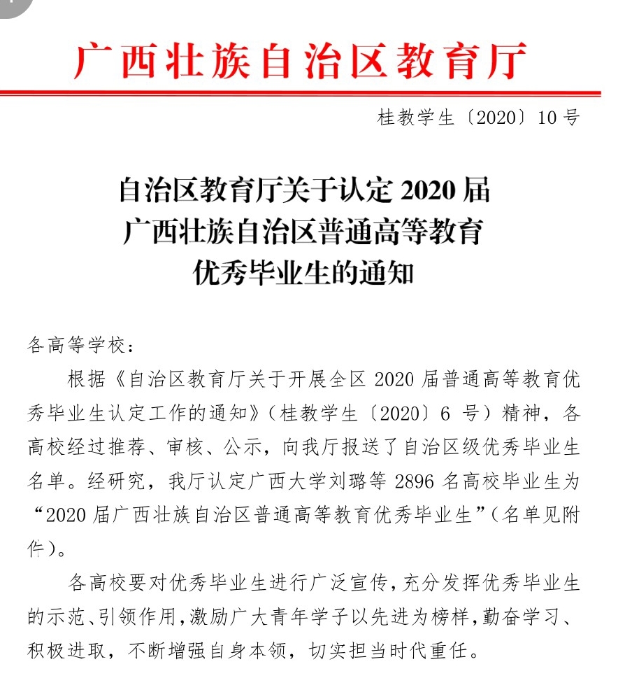 近日,自治区教育厅下发《关于认定2020届广西壮族自治区普通高等教育优秀毕业生的通知》认定全区各高校2896名毕业生为“2020届广西壮族自治区普通高等教育优秀毕业生”,其中,我校2020届毕业生安胜切等50名同学被评为“2020届广西壮族自治区普通高等教育优秀毕业生”。