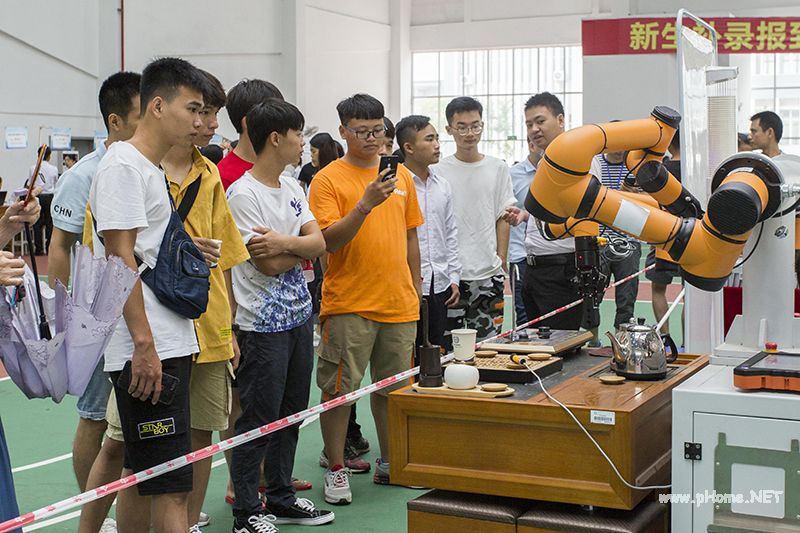 专业展示区智能工程学院的沏茶机器人引来新生围观