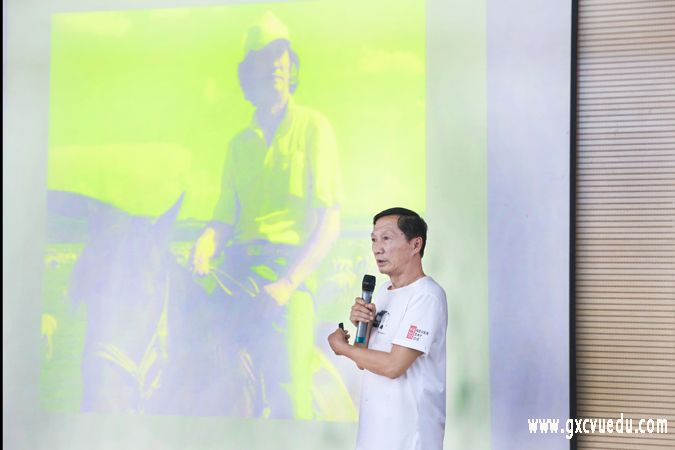讲座开始,王教授给同学们分享了个人经历,并以图片的形式讲述“艺术与人生”的哲学道理。首先王教授为同学们展示并讲解第一幅图《尽瘁》,画中主要绘的是向日葵,王教授告诉我们向日葵是一种朴素的花,它本身就是一种向阳精神,就如一提到井冈山同学们脑海就会想起红色根据地。第二幅图《毛毛雨》描写的背景是广西当地的毛毛雨,这副画表达了妈妈的爱,像毛毛雨那样温柔。第三幅图《相随》主题是两匹马,一大一小。小马驹的身边没有陌生人的时候就脱离母亲的怀抱,蹦蹦跳跳。但是有陌生人接近就会跑向母亲身边,体现母子的情恩。王教授希望同学们能像《尽瘁》一样简单朴素,像《毛毛雨》、《相随》一样满怀感恩之心。