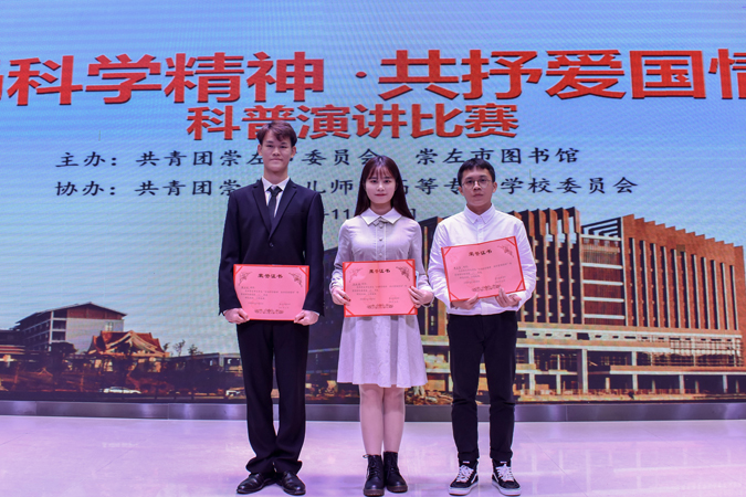 为推动“创新、绿色、开放、共享”的发展理念深入人心,激发广大青年创新意识,积极投身科学实践,11月13日,由共青团崇左市委员会举办的崇左市大学生“弘扬科学精神,共抒爱国情怀”科普演讲比赛在崇左幼儿师范高等专科学校举行,共有包括我校在内的崇左市5所高校,15名参赛选手参加。