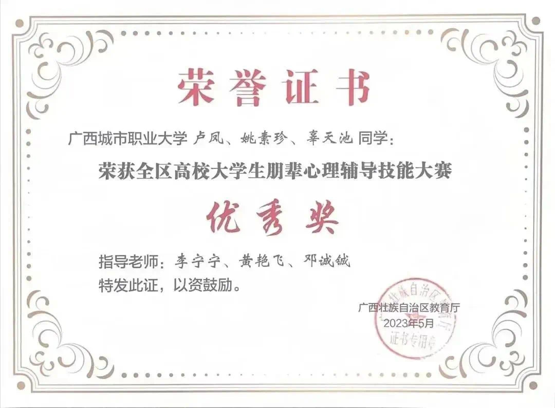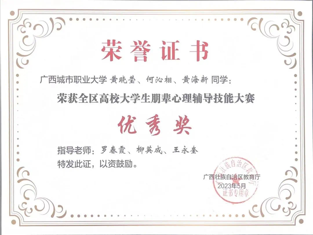 5月20日至21日,由自治区教育厅主办的2023年全区高校大学生朋辈心理辅导技能大赛在广西财经学院相思湖校区成功举行,来自全区高校的101支代表队参加了此次比赛,我校派出的两支参赛队伍均获得优秀奖的好成绩。
