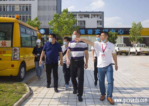 在汽车工程学院领导、老师们的带领下,到访人员首先参观了校园建设情况,随后参观汽车工程学院实训基地建设情况。参观过程中,蒙焕念主任一行表示,我校实训室区域划分详细,设备种类齐全,工具摆放整齐,并对我校汽车工程学院的实训基地建设表示赞赏。