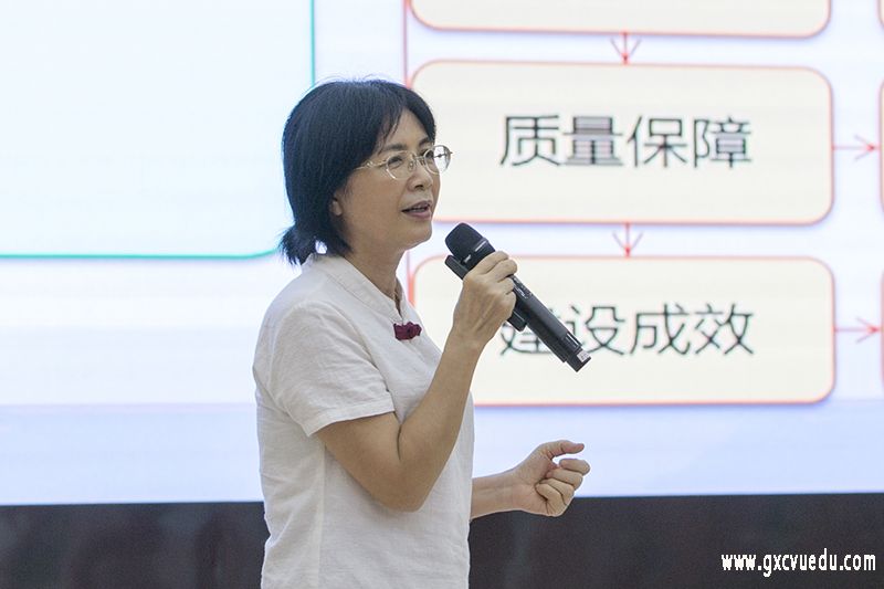 接着,广西本科职业教育研究中心副主任黄艳芳教授就星空(中国)官方体育网站一流本科专业建设标准为在场的老师们作详细解读。黄教授从标准研发的基本情况到我校一流本科专业建设标准的制定、前期理念的产生、逐渐拟定成熟的中期申报条件的提交、后期为标准制定相关策略,黄教授都一一做了详细的解读,并加上生动形象的案例分析,让专业的定位更明确,对我校今后的职业本科一流专业建设工作提出了宝贵的意见。