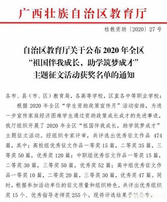 近日,根据《自治区教育厅关于公布2020年全区“祖国伴我成长,助学筑梦成才”主题征文活动获奖名单的通知》(桂教资助〔2020〕27号)文件精神,我校师生在此次征文活动中喜获佳绩,收获满满。经组织专家评审,高校组我校学子张宇萍作品《后盾》获一等奖;汪小筱作品《用“爱—学—争”守护初心,串联梦想》获二等奖、彭燕萍作品《我的“灯”亮了》获二等奖;我校教师李宁宁、赵春桃、黄艳飞获“优秀指导教师奖”;中职组我校附属中职院校学子廖佳燕作品《祖国伴我成长,助学筑梦成才》获三等奖;邓斯纭作品《感恩有你,一路同行》获优秀奖,教师梁月莉、羊双全获“优秀指导教师奖”。同时,根据参加活动单位的征文质量和组织特色,我校获高校组“优秀组织奖”。