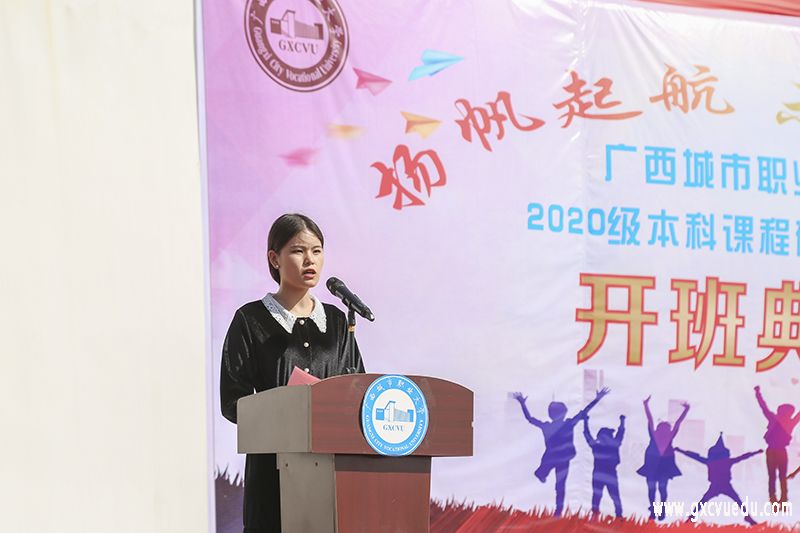 孙振保院长为崇左校区开班典礼致辞。他表示,我校作为全国首批、广西唯一的职业本科大学,是新时代职业教育改革的实践者和先行者,现共设有19个本科专业,一直都遵循“质量立校、人才强校、文化铸校、特色兴校”的办学思路,践行“明德、厚学、维新、笃行”校训精神。希望同学们在今后的学习生活中能不负学校领导和全体教师的殷切期望,刻苦专研,虚心好学,努力成为一名高素质高技能的大学生。