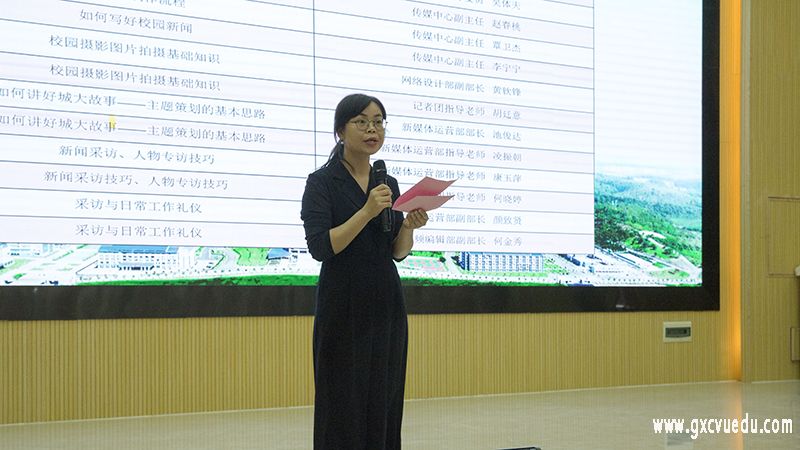 梁杭杭老师为空港校区开班仪式致辞。她表示,我校作为全国首批、广西唯一一所职业本科院校,我们站在一个全新的起点上。而媒体宣传工作作为新时代的主流趋势,在学校办学理念、校园文化等方面扩大传播,让广大师生认识到职业教育与普通教育具有同等教育的地位。在保证宣传工作的前提下要做到内容创新、质量创新,为学校的发展贡献力量。