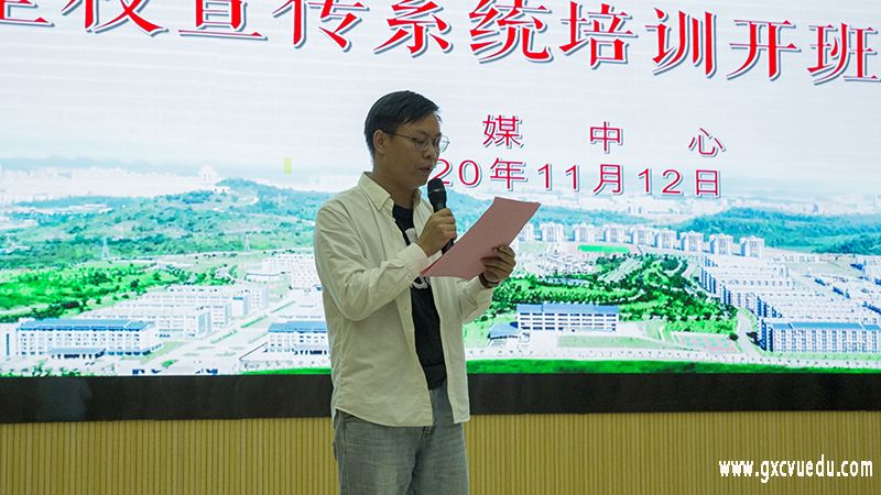 覃卫杰老师为崇左校区开班仪式致辞。他表示,作为校园宣传的工作者,要全面贯彻落实习近平总书记在全国宣传思想工作会议上的重要讲话精神,做到以习近平新时代中国特色社会主义思想统领宣传工作,提出几点要求:一是以习近平新时代中国特色社会主义思想统领宣传工作;二是牢记使命,勇担责任;三是加强学习,提高素养;四是做到内容创新,质量创新。