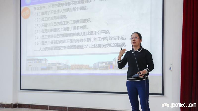 郑世珍副教授是高级经济师,多次获得广西城市职业学院的“先进工作者”和“优秀教师”荣誉称号,曾主持市厅级以上项目7项,发表学术论文二十余篇。郑世珍副教授以《人力资源管理前世与今生》为主题,从“人力资源管理课程学习”、“人力资源管理发展前景”、“人力资源管理职业生涯规划”等四个方面作专业介绍,通过招聘信息案例和人力资源岗位薪酬调查数据作分析,讲解了人力资源管理专业的发展与就业前景。课堂上,郑世珍副教授向同学们抛出了“现代社会最需要的是什么人才”“谁开发和实施人力资源管理”等专业问题,介绍了人力资源管理的岗位需求与职能。