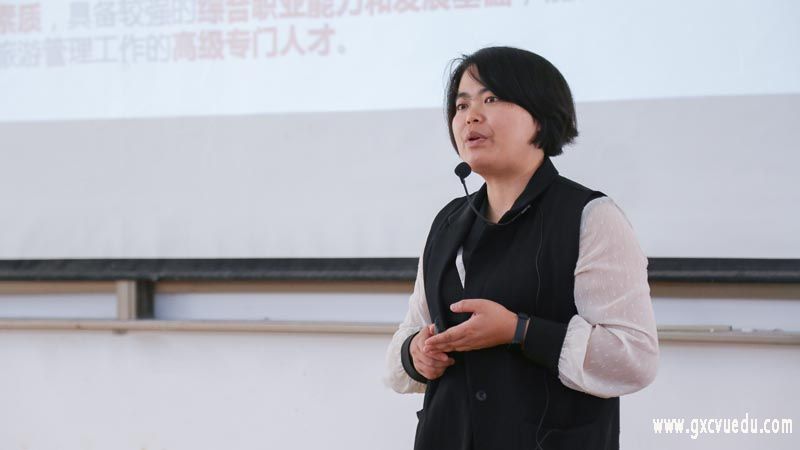 梁秋萍老师是经济师,高级面点师,旅游管理专业双师型教师,多次指导学生参加广西职业院校技能大赛获奖,同时也主持多项校级科研重点课题及教改课题。梁秋萍老师从“旅游是什么?旅游管理是什么?”“旅游管理怎么样”“旅游管理怎样学”三方面内容介绍旅游管理专业。通过对“我们为什么去旅游”的评论为切入点,让现场同学更了解旅游管理专业。针对“旅游管理没什么实质作用”“旅游管理是纯文科性质学科”“就业方向只能是服务员和导游”这三个误区作出讲解。梁秋萍老师讲到,旅游管理专业是智商和情商的双提升,需要强硬的心理素质与扎实的专业基础。