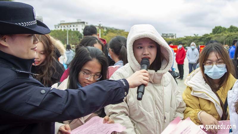 活动现场以宣传横幅、宣传海报等图文并茂的方式向观众介绍了违法犯罪、平安建设扶绥的案例,还以有奖竞答的方式激发师生们深入了解学习违法犯罪知识的兴趣。现场气氛十分活跃, 我校师生纷纷举手抢答,积极踊跃地回答每一个问题。