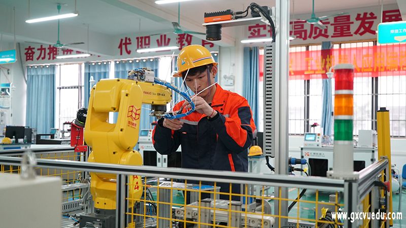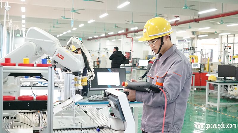 考试过程中考生们认真完成理论考试,实操考试穿上实训服,带上安全帽,考生们对工业机器人进行认真的调试、操作、编程,真正能做到学以致用。