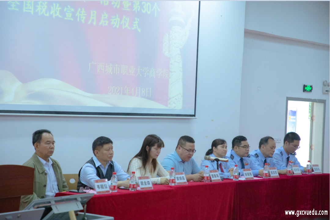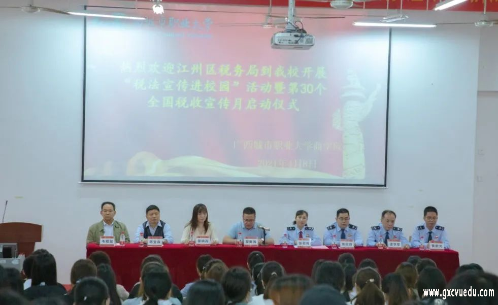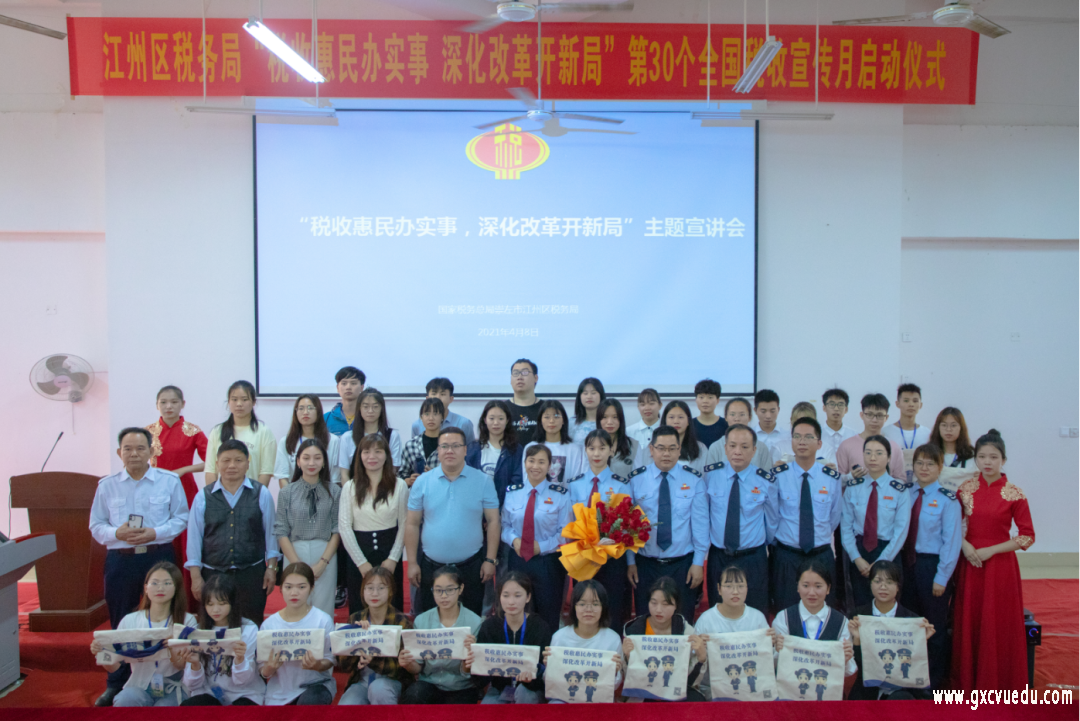 为加强税法宣传工作,让广大青年学生学习税法,了解税法,营造诚信纳税的良好氛围,提高税法遵从度和社会满意度,4月8日,我校商学院和崇左市江州区税务局携手开展“税收惠民办实事,深化改革开新局”主题税收宣传活动暨第30个全国税收宣传月启动仪式。税务局副局长张若梅、黄宗容,办公室主任黄新光,纳税服务股股长谭学军,商学院院长蒙振海,商学院副院长蒙晓霞,高师工作室教授蒋金森、韦程懿出席仪式。商学院会计专业各班级代表约200人参加了此次活动。