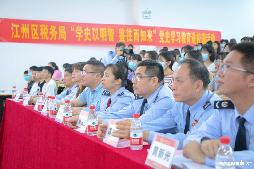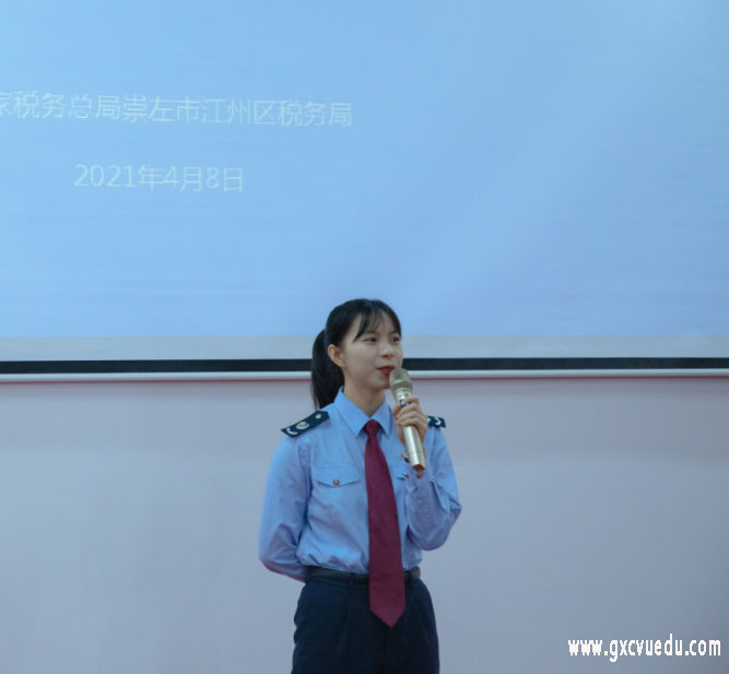 江州区税务局干部龙娟娟从“税收和我们的关系”“税收征管与服务的发展”“毕业生就业创业税收优惠政策”“与税务相关的会计专业学生从业方向”四个方面深入浅出地讲解了税收知识,税收的理念、税收的产生、税收的演变与发展等,并讲解了税收是国家财政的重要组成部分以及“税收取之于民,用之于民”的道理。