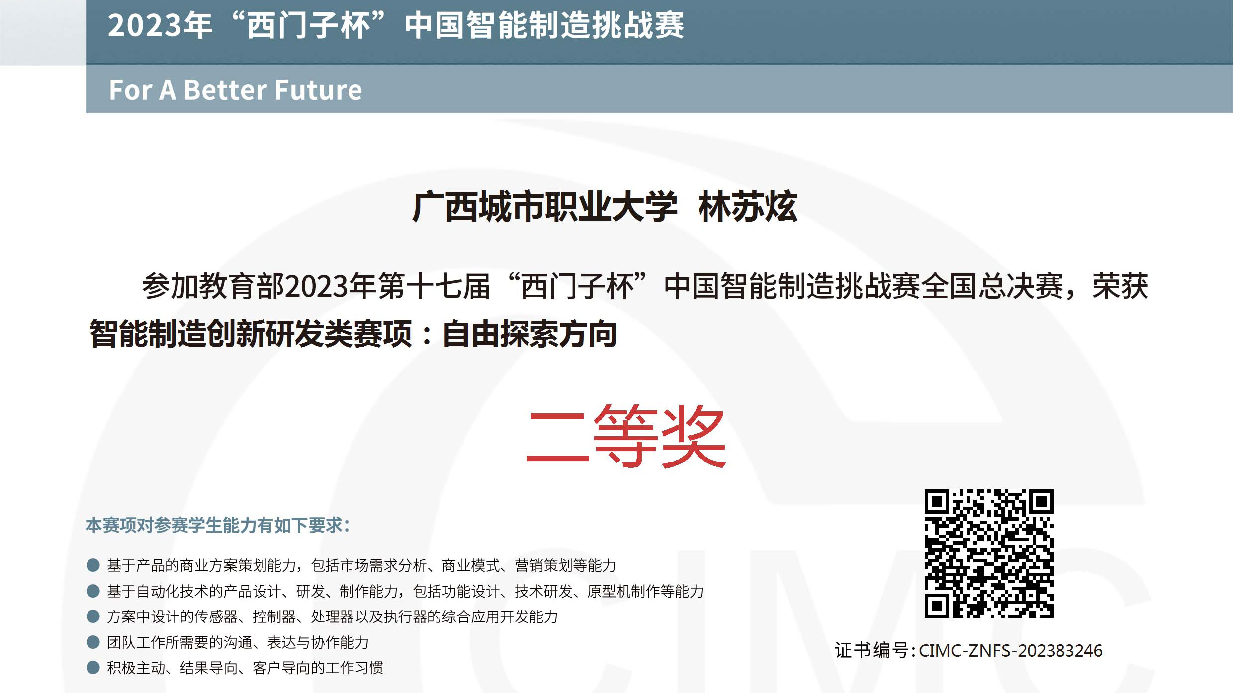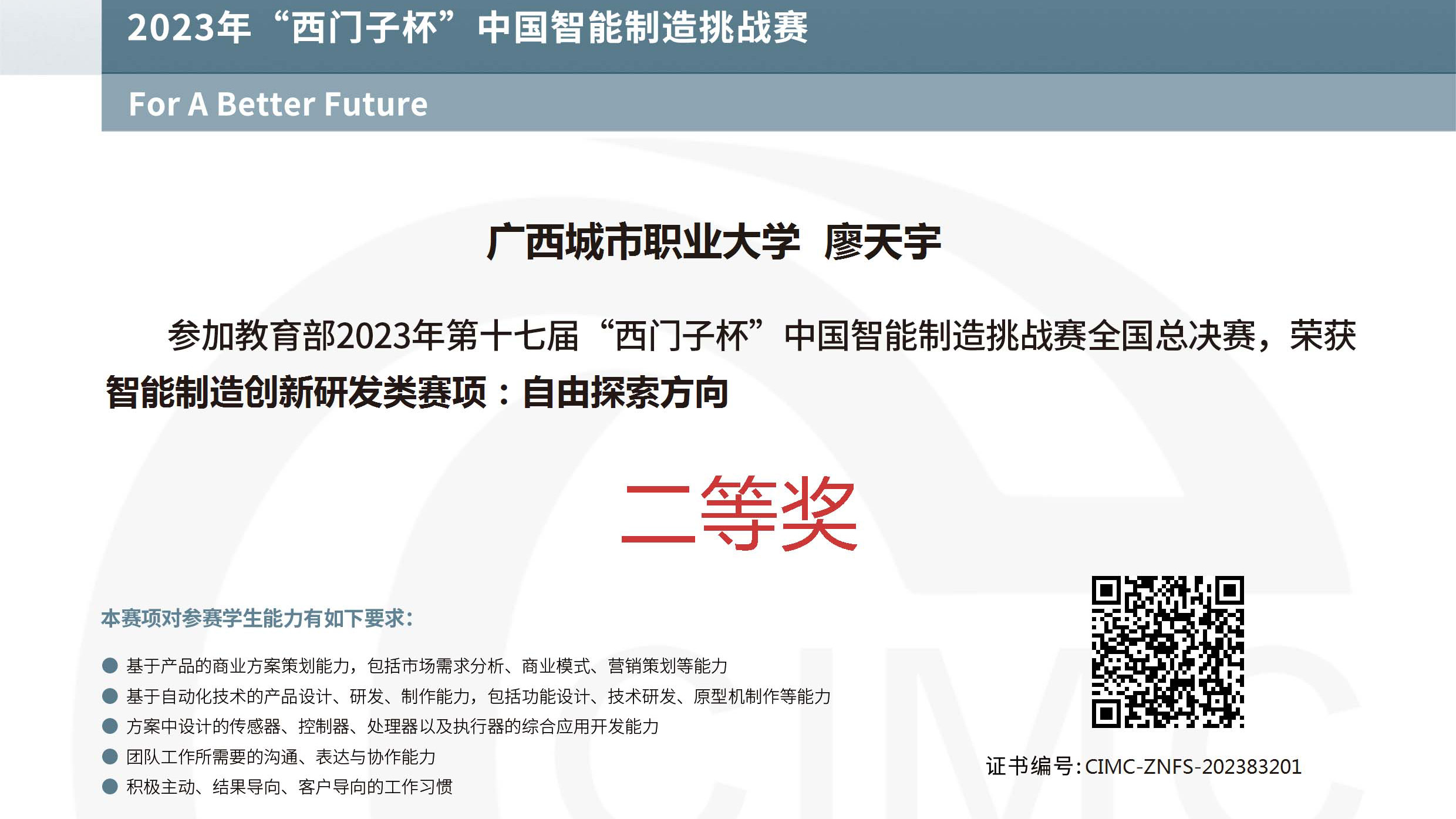 全国总决赛有来自243所高校的523支队伍参与到各大奖项的争夺,我校智能工程学院共有两支队伍进入到总决赛的争夺中,其中,林苏炫、廖天宇、李钦群组成的参赛队获得智能制造创新研发类赛项全国总决赛二等奖的优异成绩,指导教师为徐建刚、廖艾。
