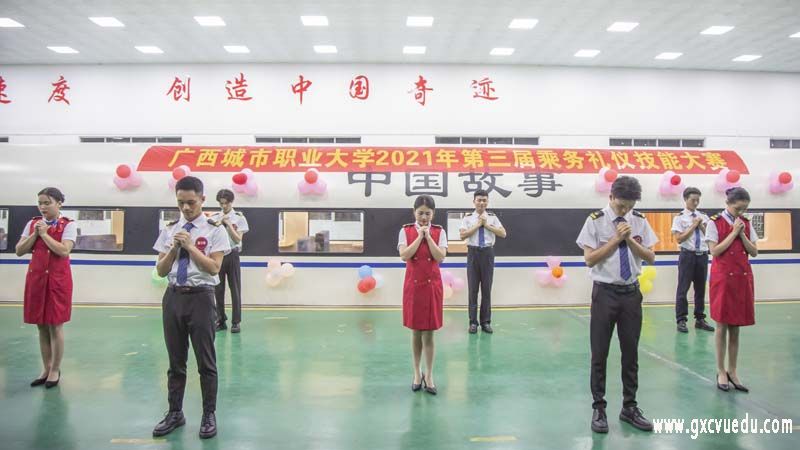 为提高我校大学生职业素养,展现当代大学生的风采,6月8日,管理学院在空港校区高速铁路客运乘务实训基地举办2021年第三届乘务礼仪技能大赛。管理学院院长唐臣出席大赛并致辞,黄西宁、黄忠衡、林晓柔、刘佳辰四位老师担任评委。管理学院2019级、2020级高速铁路客运乘务(以下简称:高铁)专业和空中乘务(以下简称:空乘)专业学生组成九支参赛队伍进行比赛。