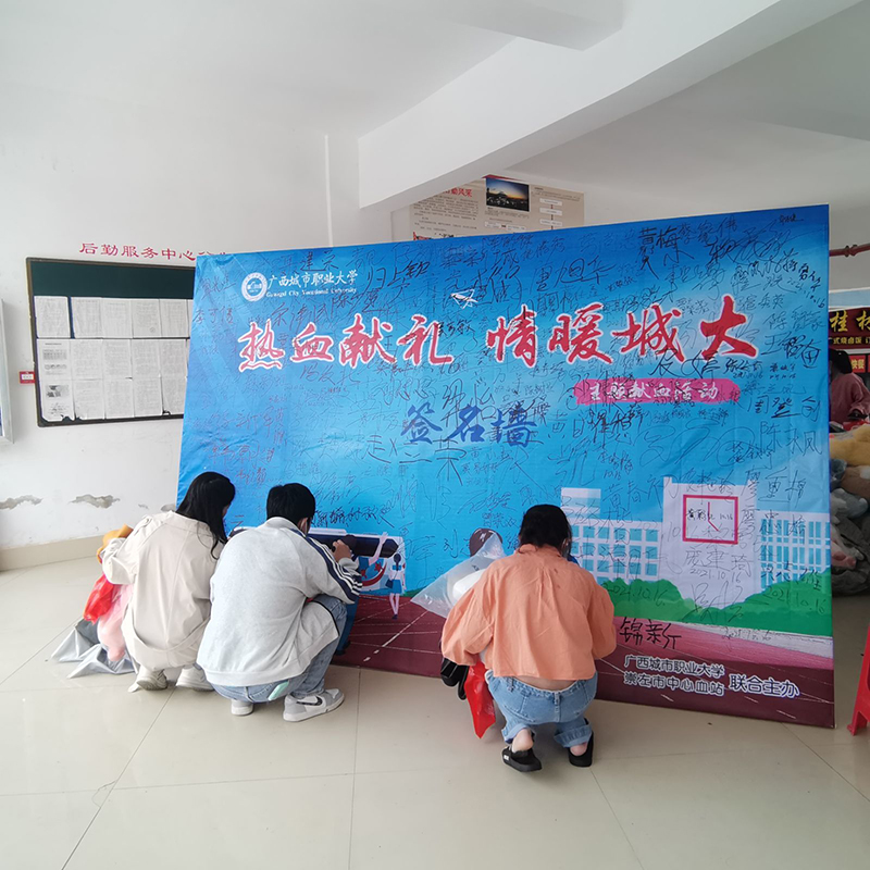 活动现场人头攒动,虽然天上下着小雨,但是这丝毫没有减退前来献血的人的热情,医护人员还设立了献血咨询处,为大家科普献血小知识。同学们排队咨询,填表,验血,抽血等进行的有条不紊。值得一提的是,崇左中心血站还为同学们悉心准备了小礼物,前来献血的同学们纷纷在签名墙上留下自己的名字。