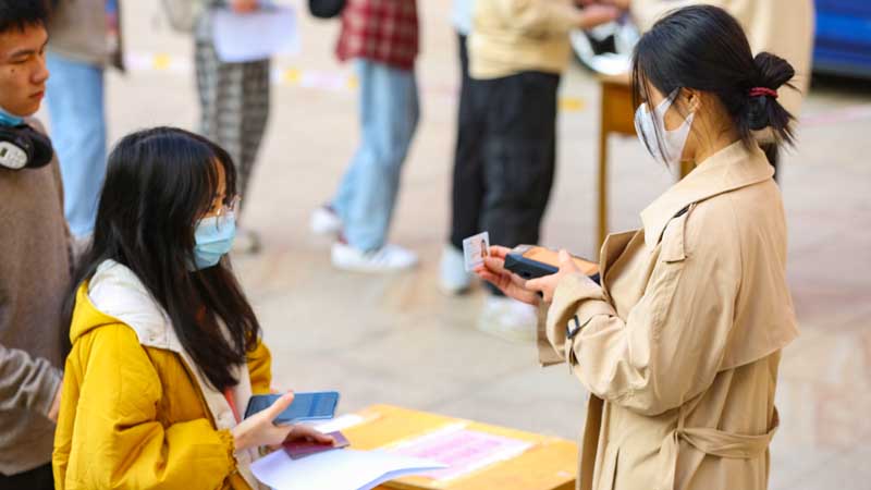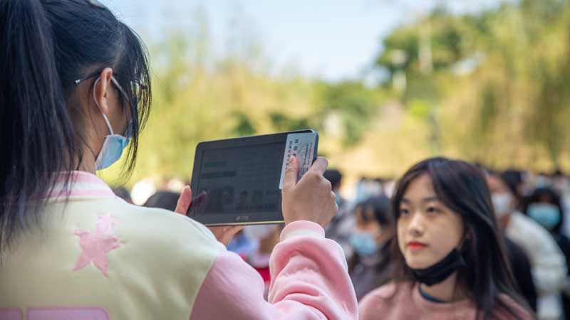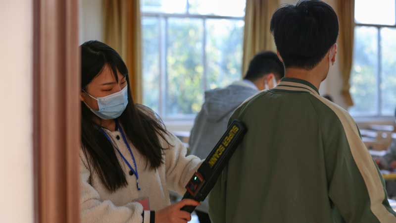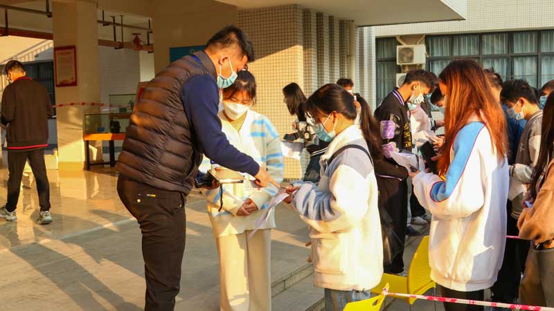 考试开始前半小时,考生在志愿者的协助下,出示绿色健康码、测量体温、验核个人信息、有序进入考场。