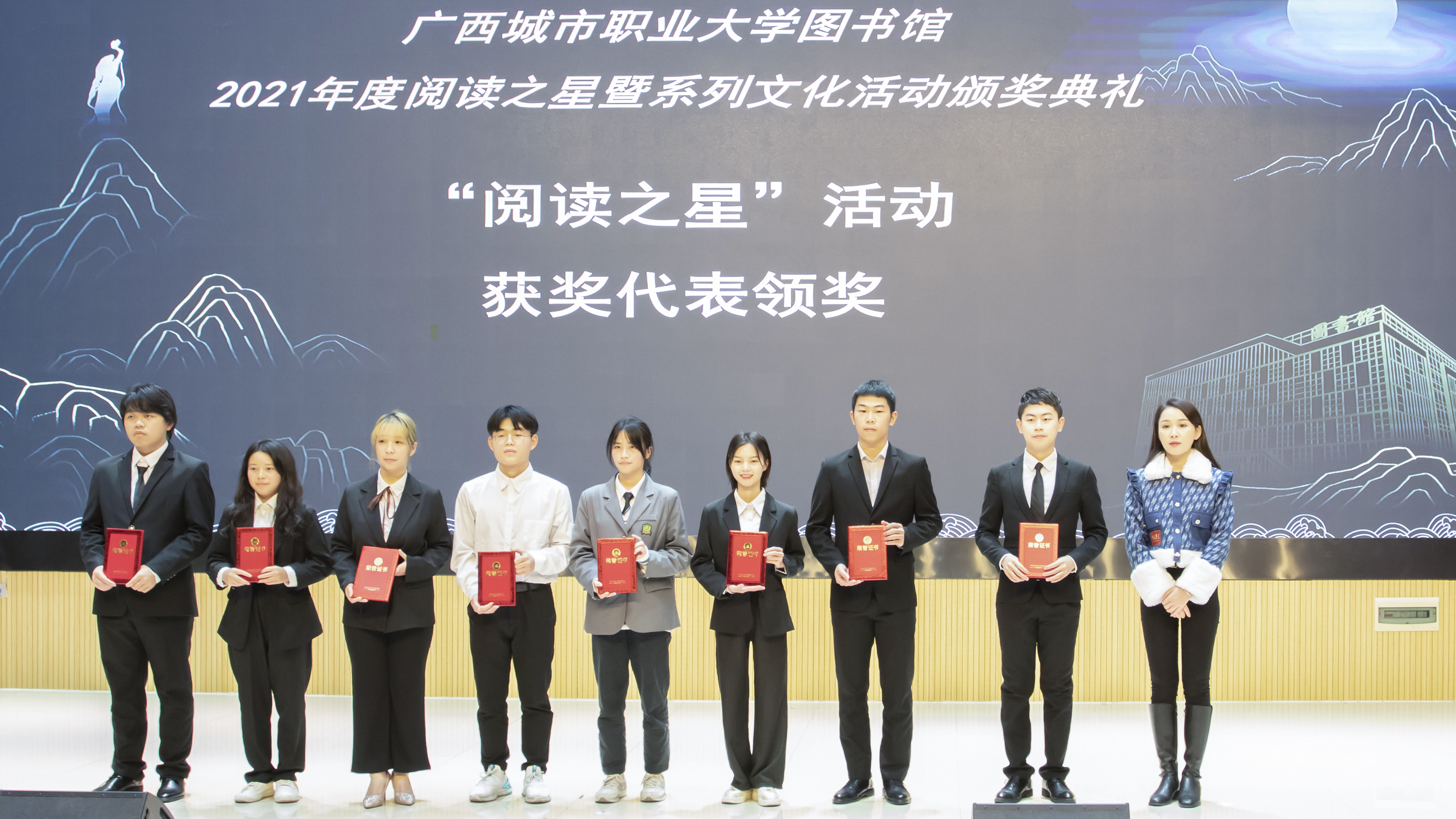 为进一步倡导同学们阅读新风尚,享受读书乐趣,提高文化自信,1月8日晚,图书馆在崇左校区教育学院演奏大厅举办2021年度“阅读之星”暨图书馆系列文化活动颁奖典礼。出席本次活动的有学校校长李中华、管理学院党总支书记黄艳华、传媒中心副主任李宁宁、教育学院副院长莫婷婷、信息工程学院副院长蒙梁亦等领导老师及各学院师生代表。