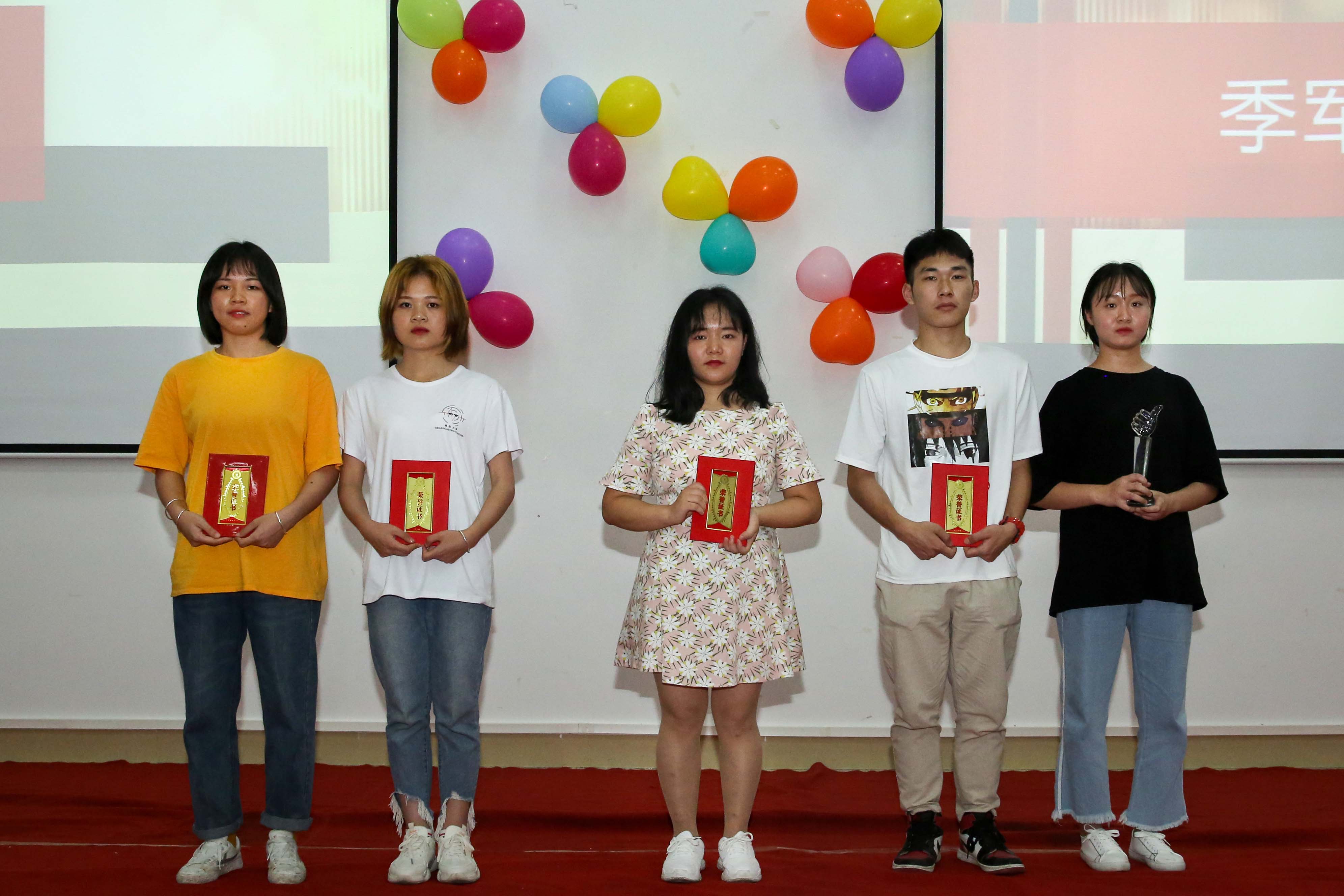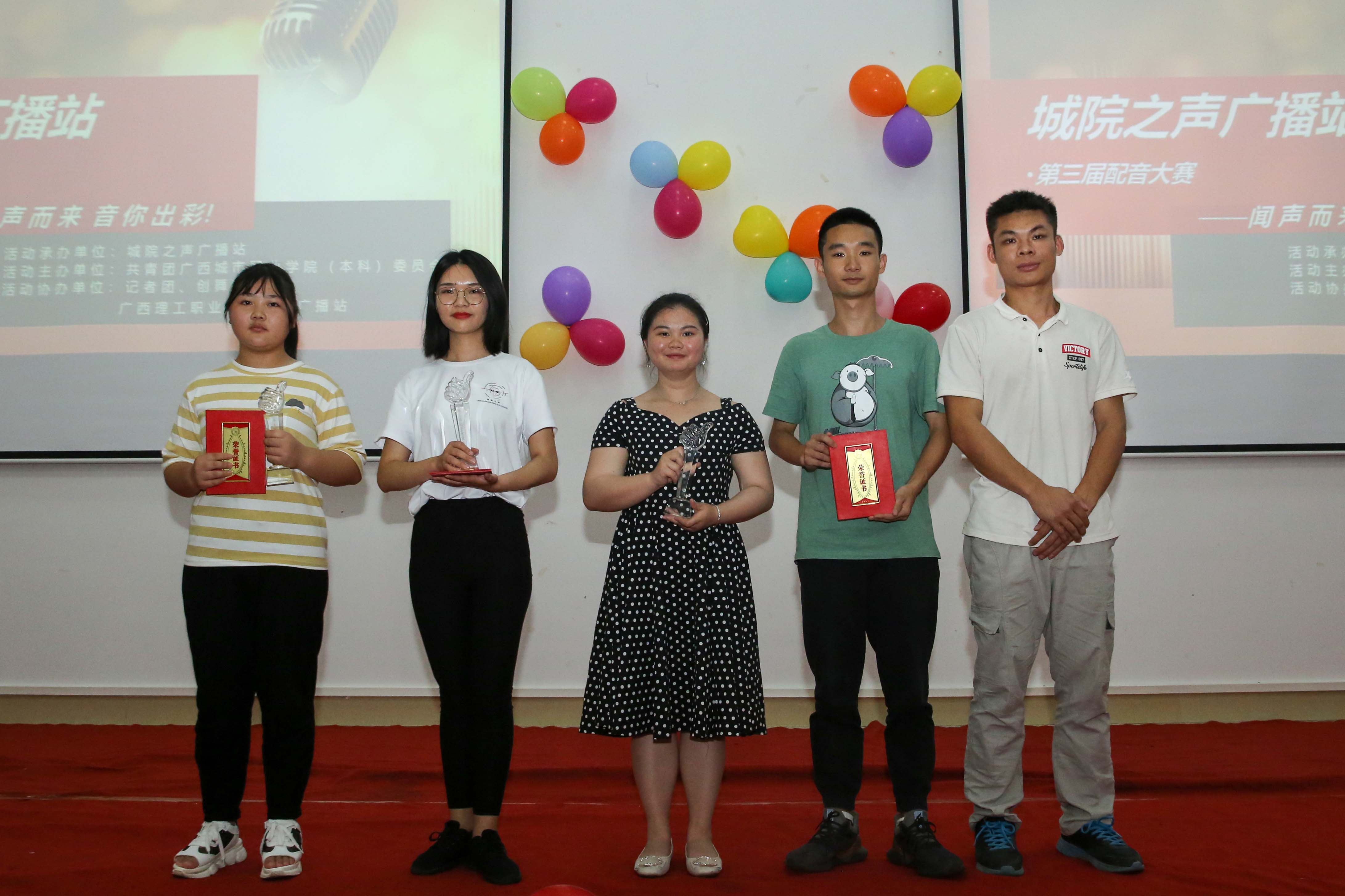 配音大赛最后,农国艺、李浩、黄雨西共三位老师上台为获奖学生进行颁奖,并合影留念。
