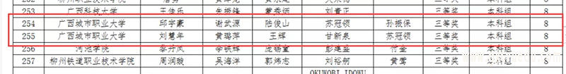 苏冠领、许书娟两位老师指导参加第八赛道的雷麒、黄国忠、韦清华全身心投入到实战中,在实验中找问题,在问题上找方法,不断创新,最终,两队均以以优异的成绩从众多参赛选手中脱颖而出,荣获区级一等奖。