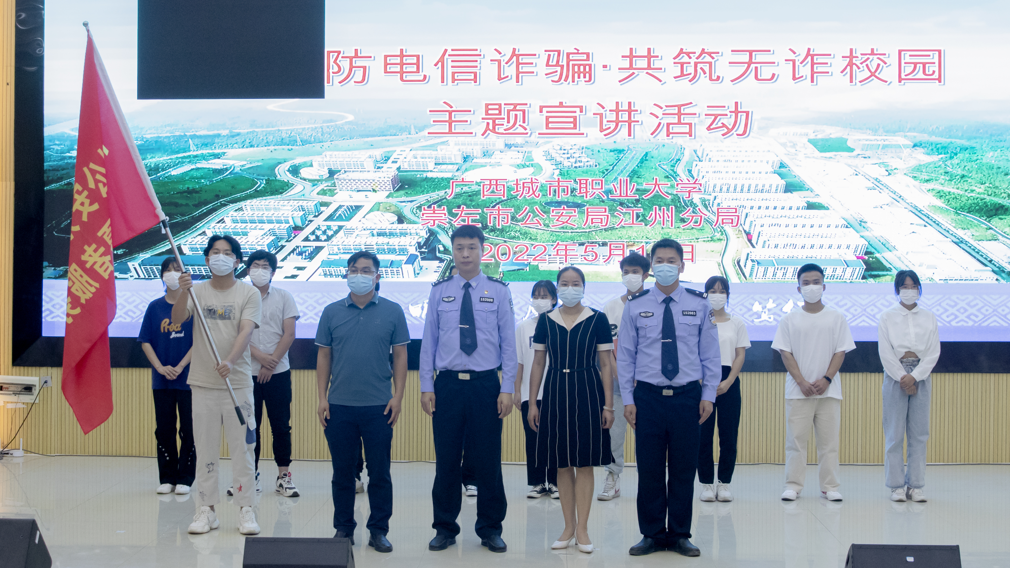 为提高广大师生对电信诈骗手法的识别和防范能力,增强安全防范意识,遏制校园电信网络案件的发生,5月19日,我校分别在崇左校区演奏大厅、空港校区厚学楼阶梯三教室开展“预防电信诈骗·共筑无诈校园”主题宣讲活动。讲座主讲人分别为崇左市公安局江洲分局党委委员、副局长廖宇坤以及扶绥县公安局交警大队副队长李剑君,我校师生代表聆听本次讲座。
