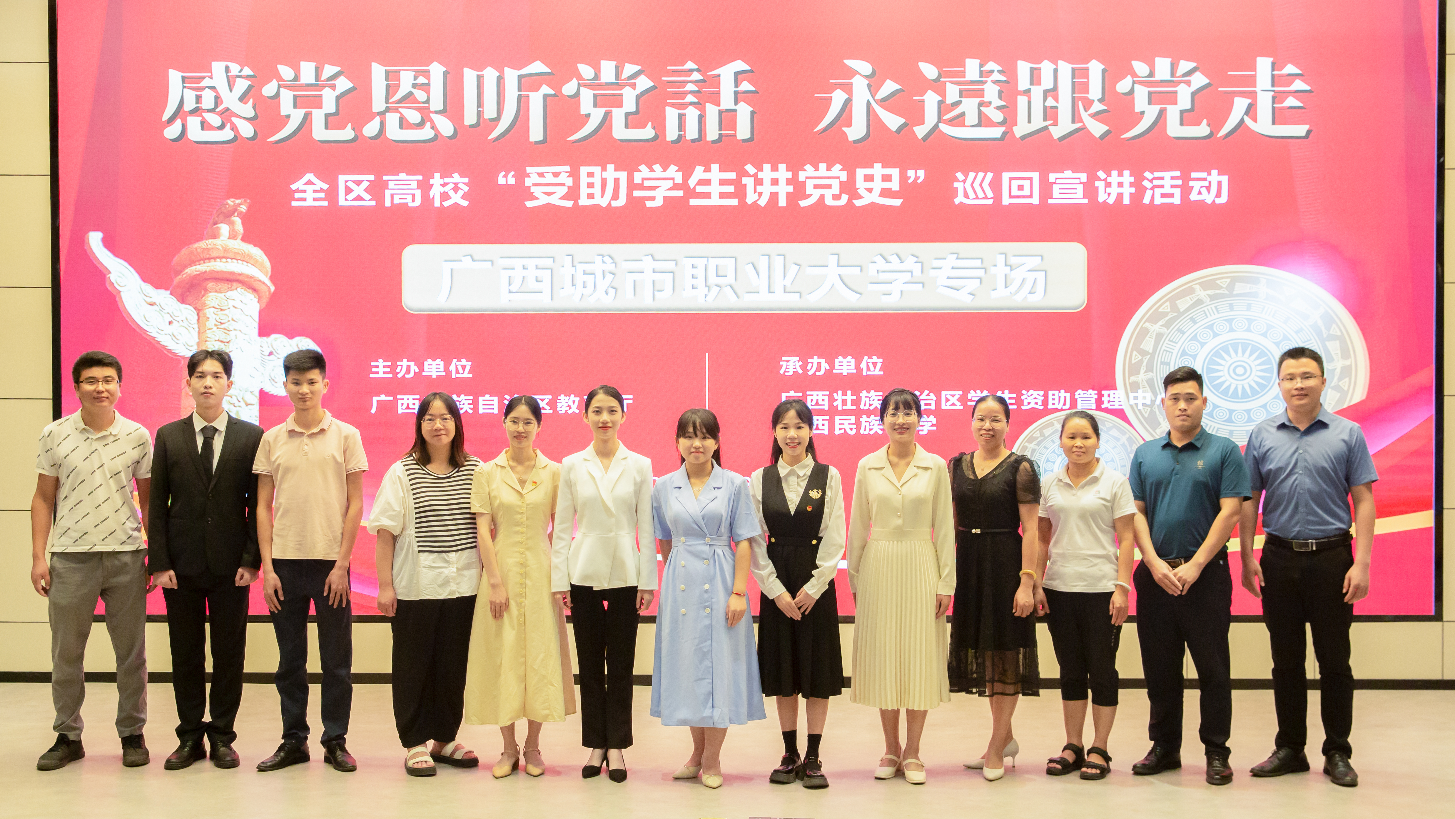 近日,为响应号召《自治区教育厅办公室关于开展2021年全区高校“受助学生讲党史”巡回宣讲活动的通知》(桂教办(2021)929号)的精神,深入学习贯彻习近平总书记在庆祝中国共产党成立100周年大会上的重要讲话精神,教育和引导受助学生赓续红色血脉、传承红色基因,深入推进受助学生在党史学习教育中不断走深走实,创新资助育人方式,6月19日,我校在崇左校区15区报告厅开展“受助学生讲党史”巡回宣讲活动。宣讲人由四位成员组成,其中有我校学子陆琦、谢芸妮,以及来自广西崇左幼儿师范高等专科学校的张雨莹,来自广西民族师范学院的卢嘉欣。广西民族大学施瑜老师,我校学工部(处)副处长柳英成,学工部处资助办公室主任廖兰敏及各学院师生代表参加本次活动。