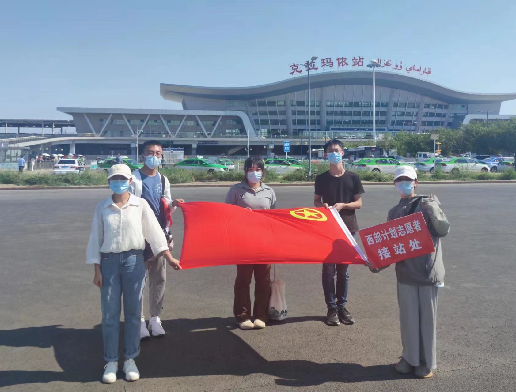 罗舒卓同学(右一)在克拉玛依站的接待处与伙伴们的合影