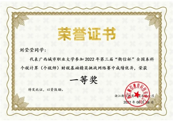 近日,由中国高等教育学会高等财经教育分会主办,浙江衡信教育科技有限公司提供技术支持的第三届“衡信杯”全国个税师精英挑战赛落下帷幕。我校商学院大数据与会计专业、大数据与财务管理专业的194名学生参加比赛,经过一个半月的精彩比拼,最终荣获本科组团体赛一等奖、高职组团体赛一等奖。我校入围全国百强本科人数共25人,其中刘莹莹、卢品伶同学皆获本科组个人现金奖一等奖,分别排名全国第二名、全国第三名。边海洋、梁柳娟、蒋和平、蒙振海、赵容秀、黄麒晓荣获“优秀指导老师”称号。
