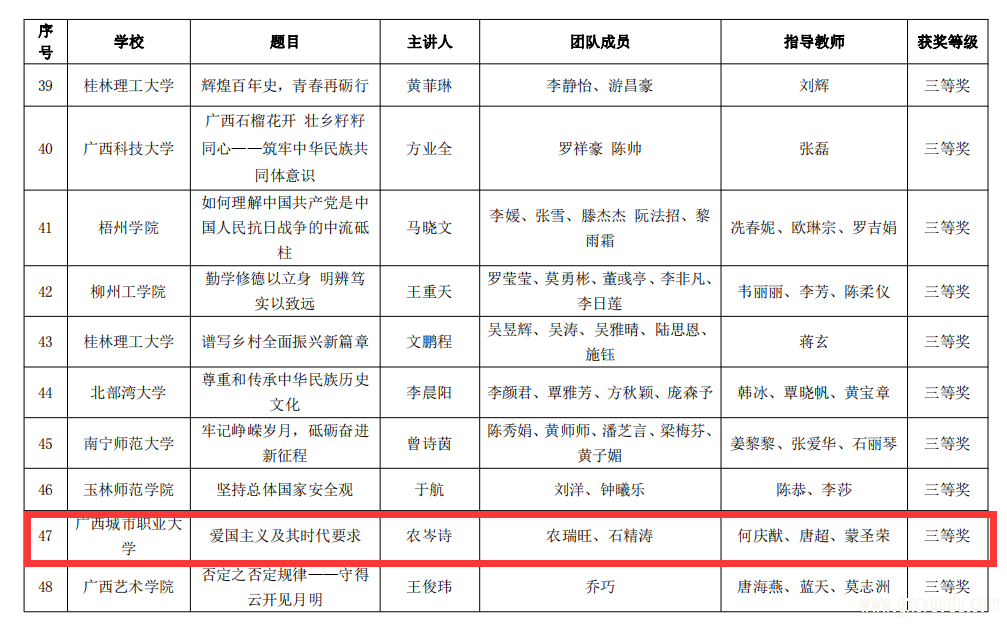近日,根据《自治区教育厅关于公布习近平新时代中国特色社会主义思想大学习领航计划2022年系列主题活动获奖作品名单的通知》(桂教思政[2022]19号)悉知,由马克思主义学院何庆猷、唐超、蒙圣荣老师指导,建筑工程专业农岑诗同学主讲的思政课《爱国主义及其时代要求》荣获本科组三等奖。