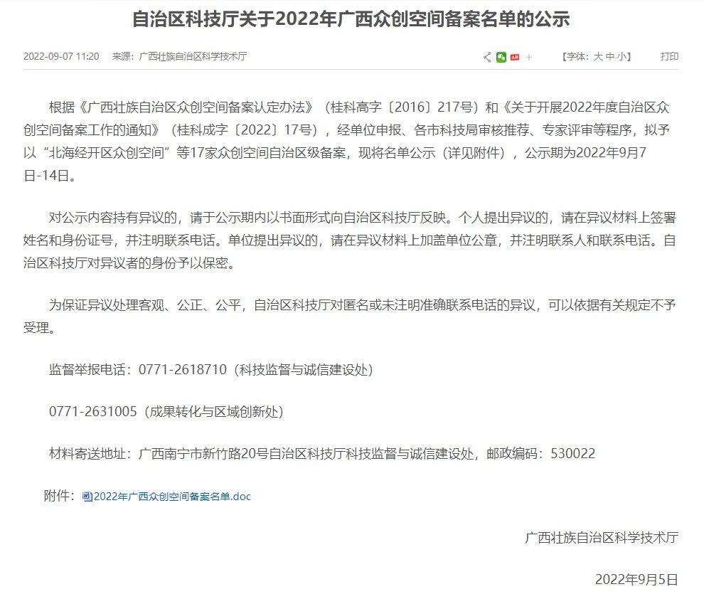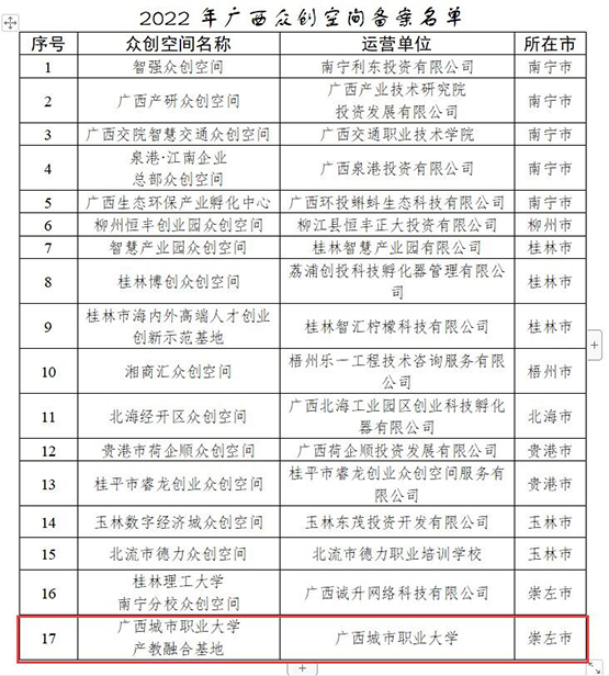 此外,自治区科技厅9月16日发布2022年度自治区备案众创空间名单的通知(桂科成字〔2022〕91号),我校产教融合基地成功备案2022年度自治区众创空间名单。