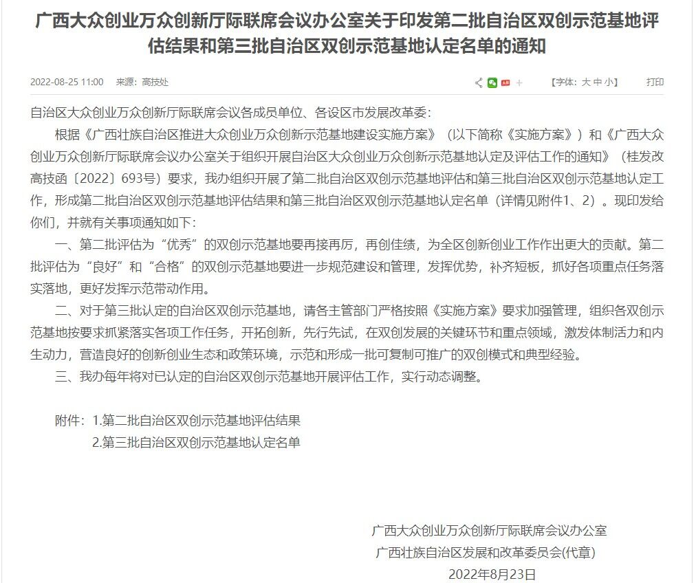 根据《广西壮族自治区推进大众创业万众创新示范基地建设实施方案》和《广西大众创业万众创新厅际联席会议办公室关于组织开展自治区大众创业万众创新示范基地认定及评估工作的通知》(桂发改高技函〔2022〕693号)要求,自治区发展改革委组织开展了第二批自治区双创示范基地评估和第三批自治区双创示范基地认定工作,并对第三批自治区双创示范基地拟认定名单进行了公示。经学校积极申报、专家评估及评审,我校获第三批自治区大众创业万众创新示范基地认定。
