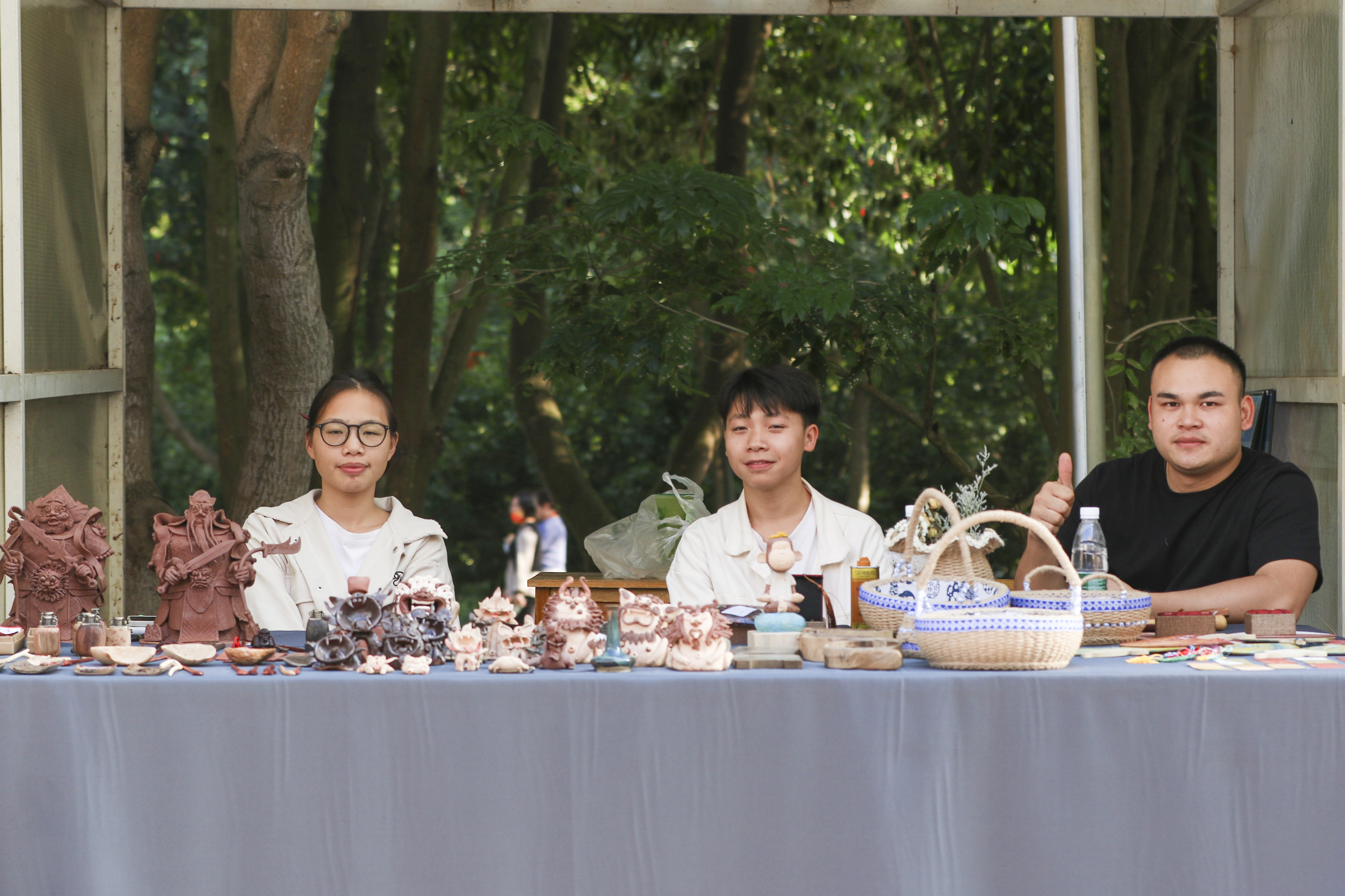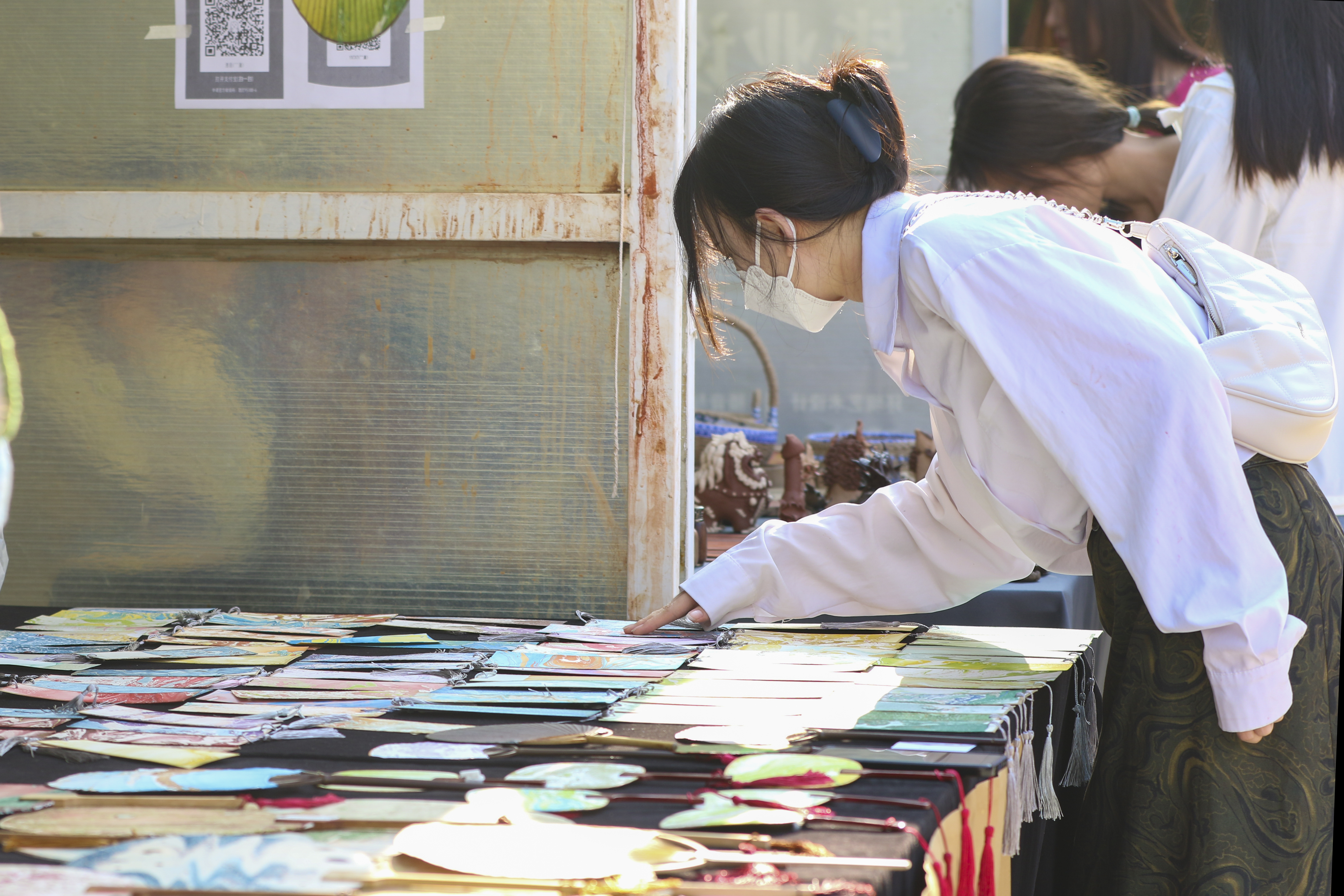 学以致用,创业创新也是本次毕业展的重要内涵,在二教广场外学子们开展创意集市活动,各专业学子将自己制作的花瓶、陶瓷摆件、书签等手工艺品进行售卖,2020级产品艺术设计2班韦德展《‘花山采风’古韵花山岩》系列陶瓷作品一经展出,便已被预订,“没想到自己的作品这么受欢迎,这也是对自己作品的一种肯定。”他说。