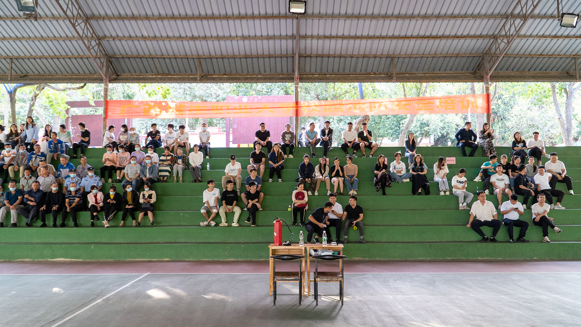 空港校区由扶绥县消防救援大队班长吕世明作主讲人,崇左校区由后勤保卫处保卫科副科长吴镝作主讲人。主讲人向现场参训人员详细讲解了校园消防存在的安全隐患问题及解决方法,重点介绍了干粉灭火器的灭火原理、使用方法及注意事项,并针对如何使用灭火器进行现场教学。