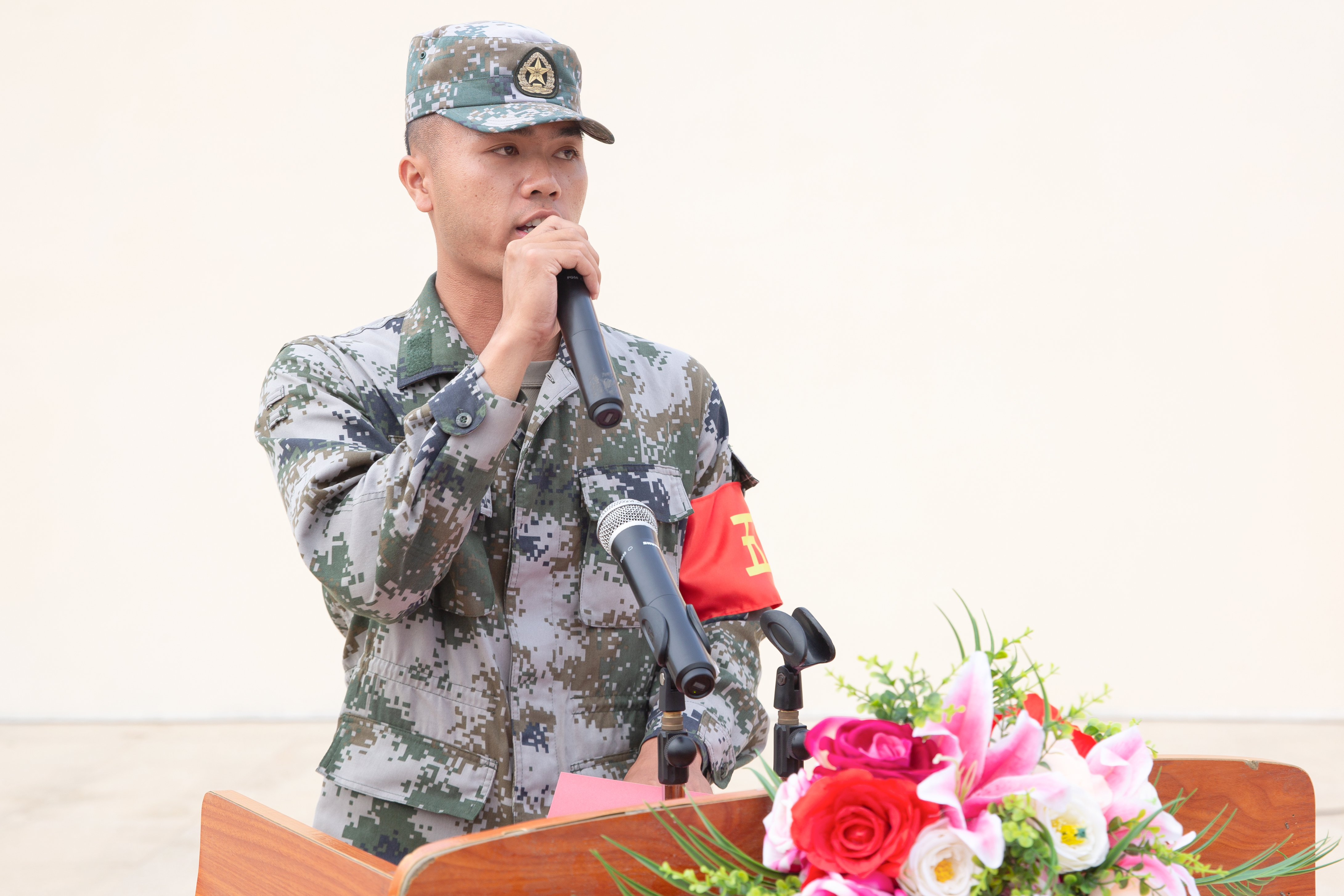 “升国旗,奏国歌”,伴随着嘹亮的国歌,国旗护卫队迈着矫健的步伐走向升旗台,在全体师生的注视下,国旗在慷慨激昂的国歌声中冉冉升起,军训汇演由此拉开序幕。