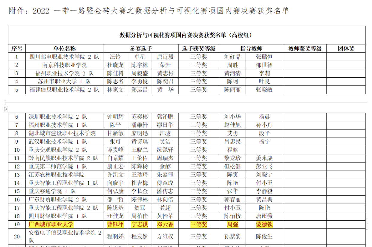 近日,2022一带一路暨金砖国家技能发展与技术创新大赛之数据分析与可视化赛项国内赛决赛成功举办,我校信息工程学院学子曹钰坪、宁志洪、邓云香在数据分析与可视化赛项国内赛决赛高校组三等奖,指导老师周强、蒙德钦。