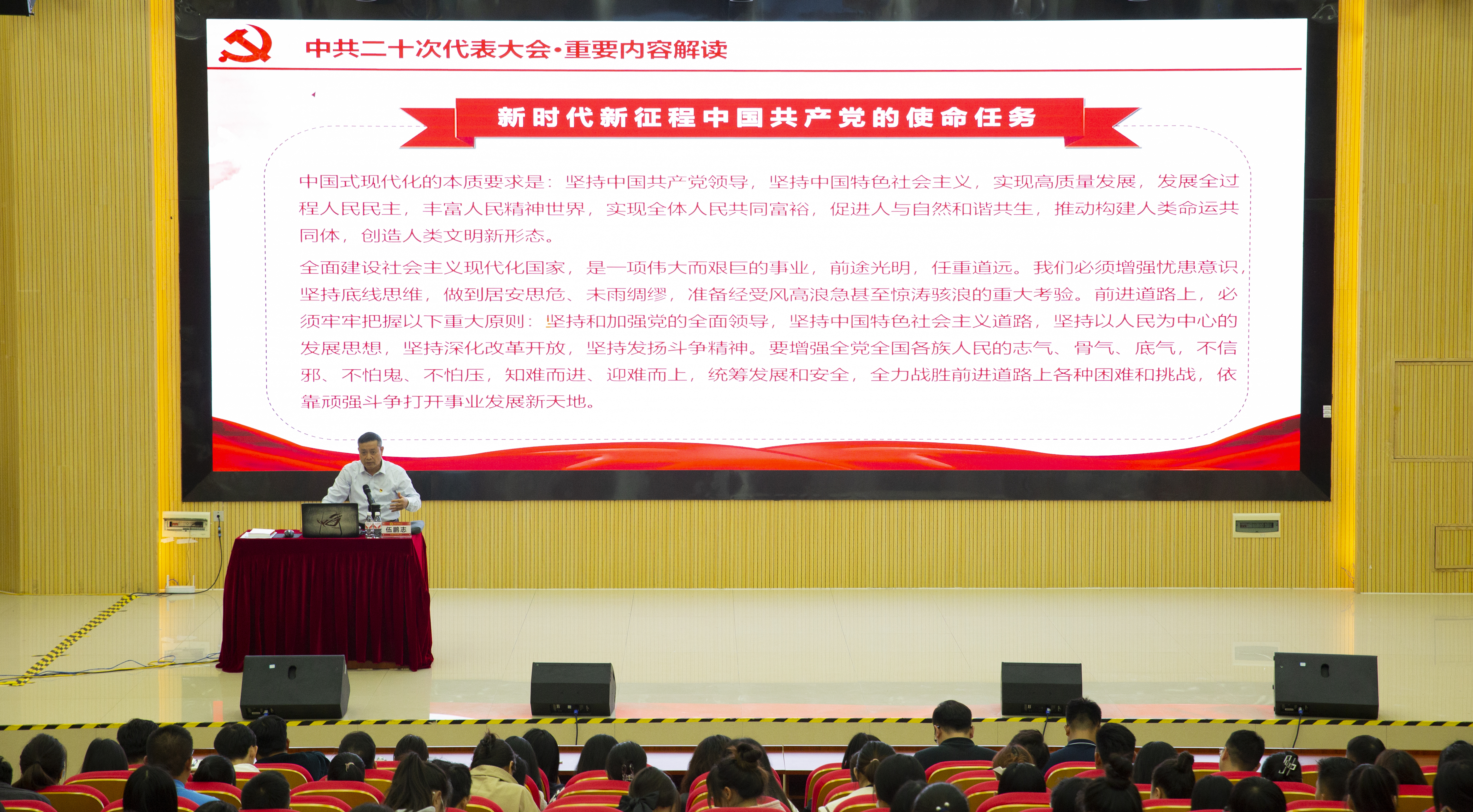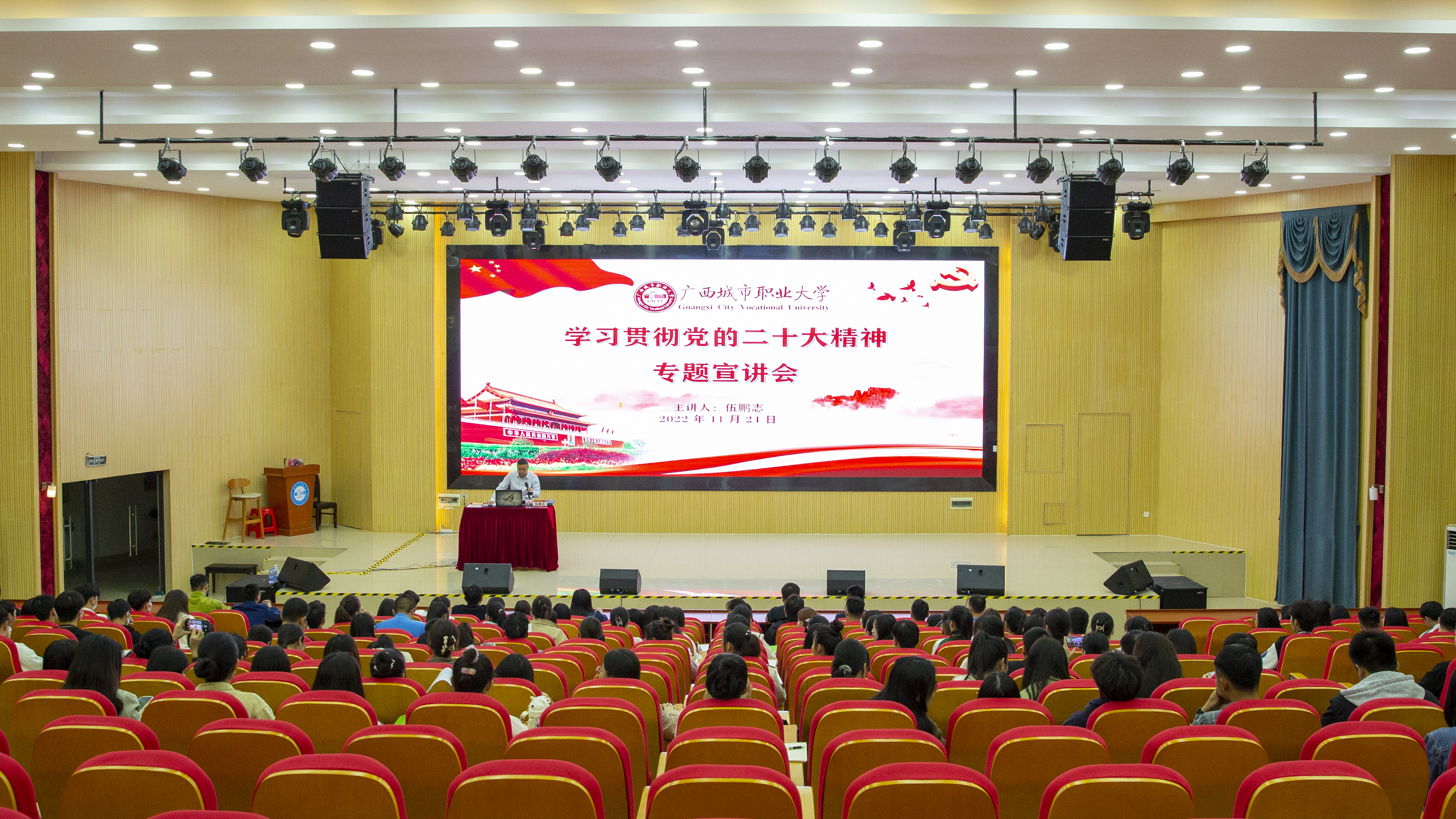 为深入学习贯彻落实党的二十大精神,推动党的二十大精神在我校师生中走深走实、入脑入心,11月23、24日晚,我校分别在空港校区厚学楼阶三教室和崇左校区教育学院演奏大厅召开“学习贯彻党的二十大精神”专题宣讲会。党委书记伍鹏志作宣讲报告,各学院党员干部、学生党员代表参加本次宣讲会。
