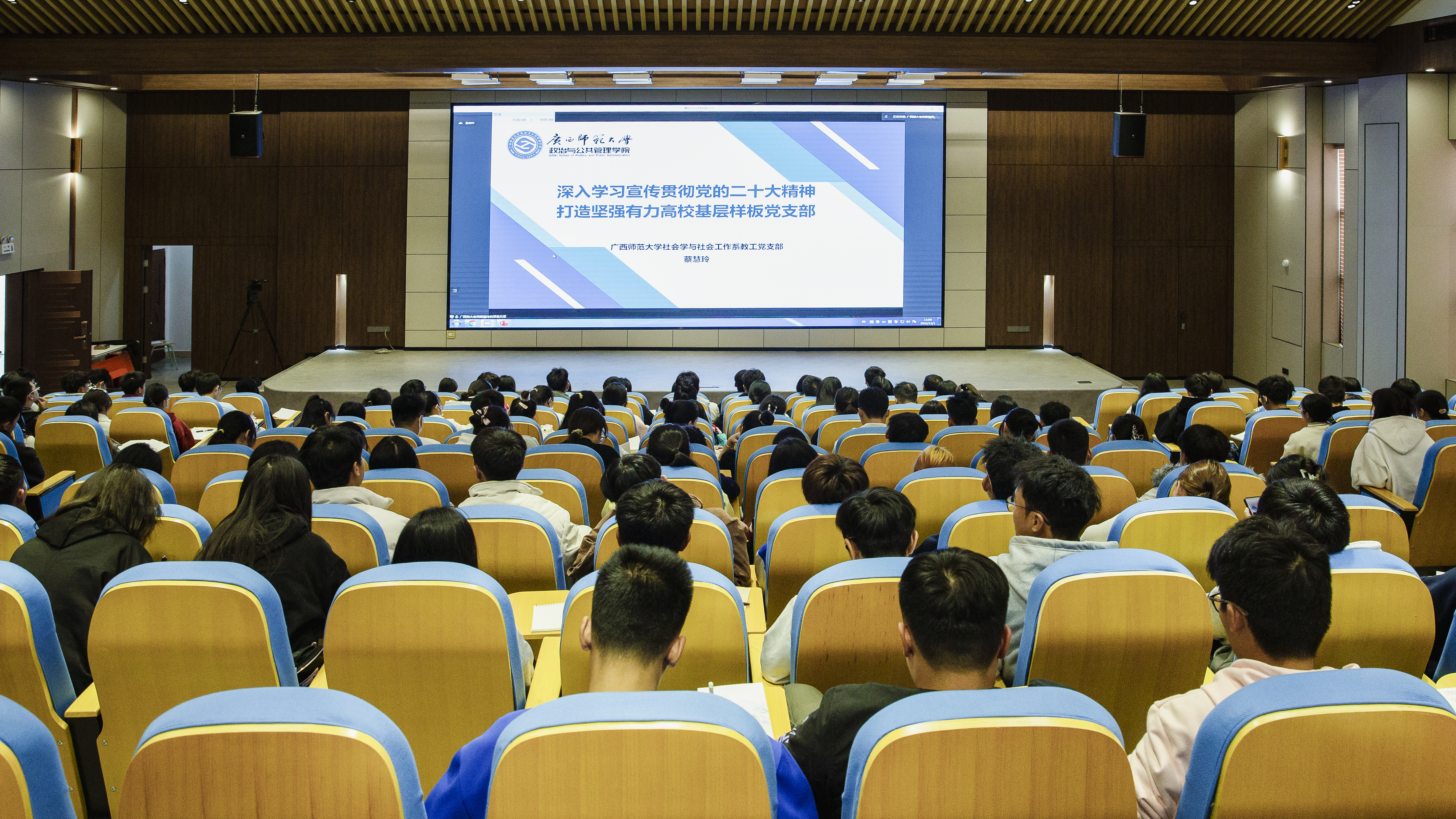 接着,广西师范大学政治与公共管理学院教师、社会学与社会工作系教工党支部书记蔡慧玲带来以“深入学习宣传贯彻党的二十大精神,打造坚强有力高校基层样板党支部”为主题的宣讲,既有理论总结又有材料剖析,既有形象说明又有事实依据,对我校师生准确完整地学习领会和贯彻落实党的二十大精神有很大的帮助。