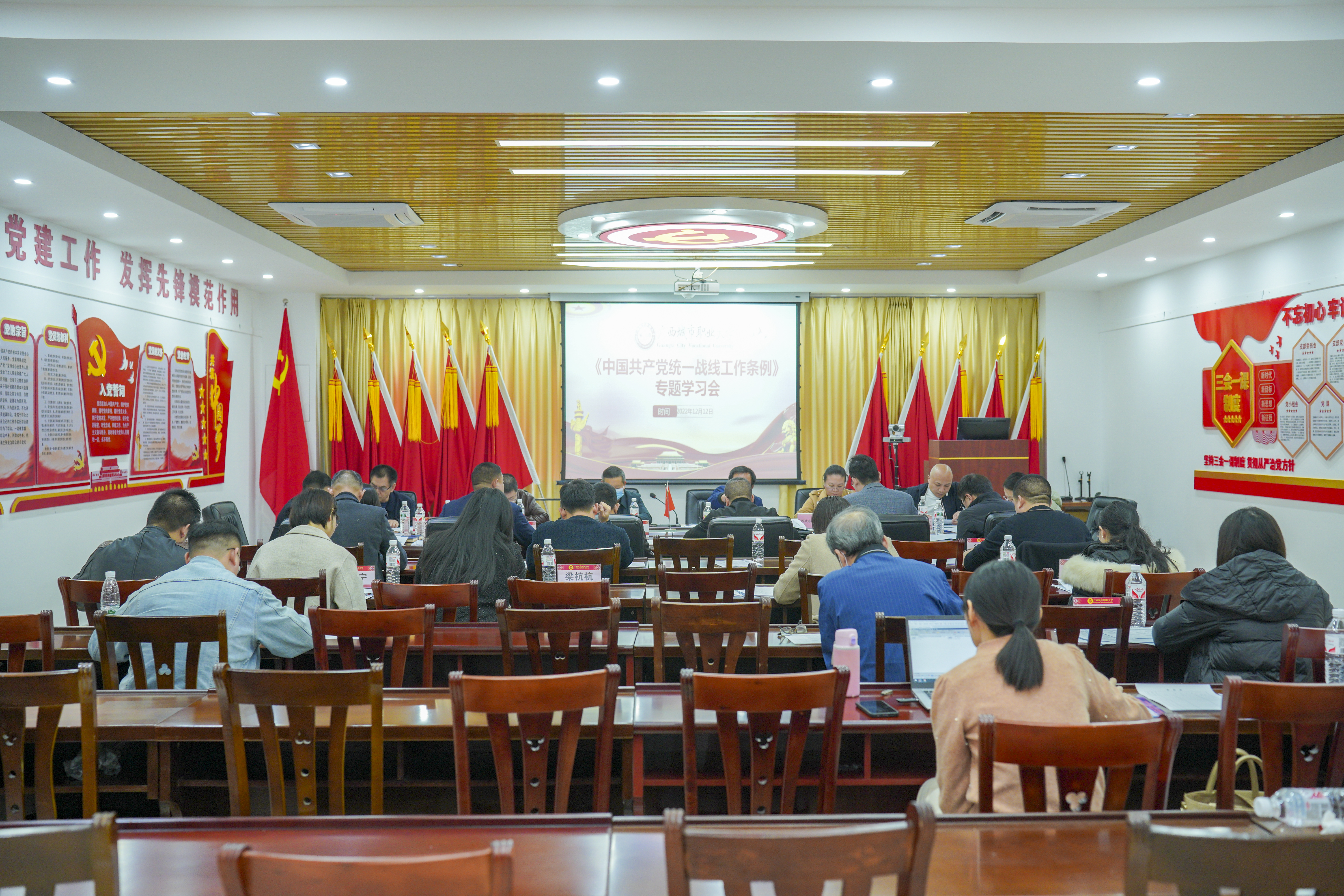 12月12日,学校党委在尚美楼三楼党员活动室开展学习《中国共产党统一战线工作条例》会议。党委书记伍鹏志,党委副书记、校长李中华,党委副书记、纪委书记习尧青,党委委员、副校长黄妙红及各学院党总支书记出席会议。统战部部长李志超主持会议。