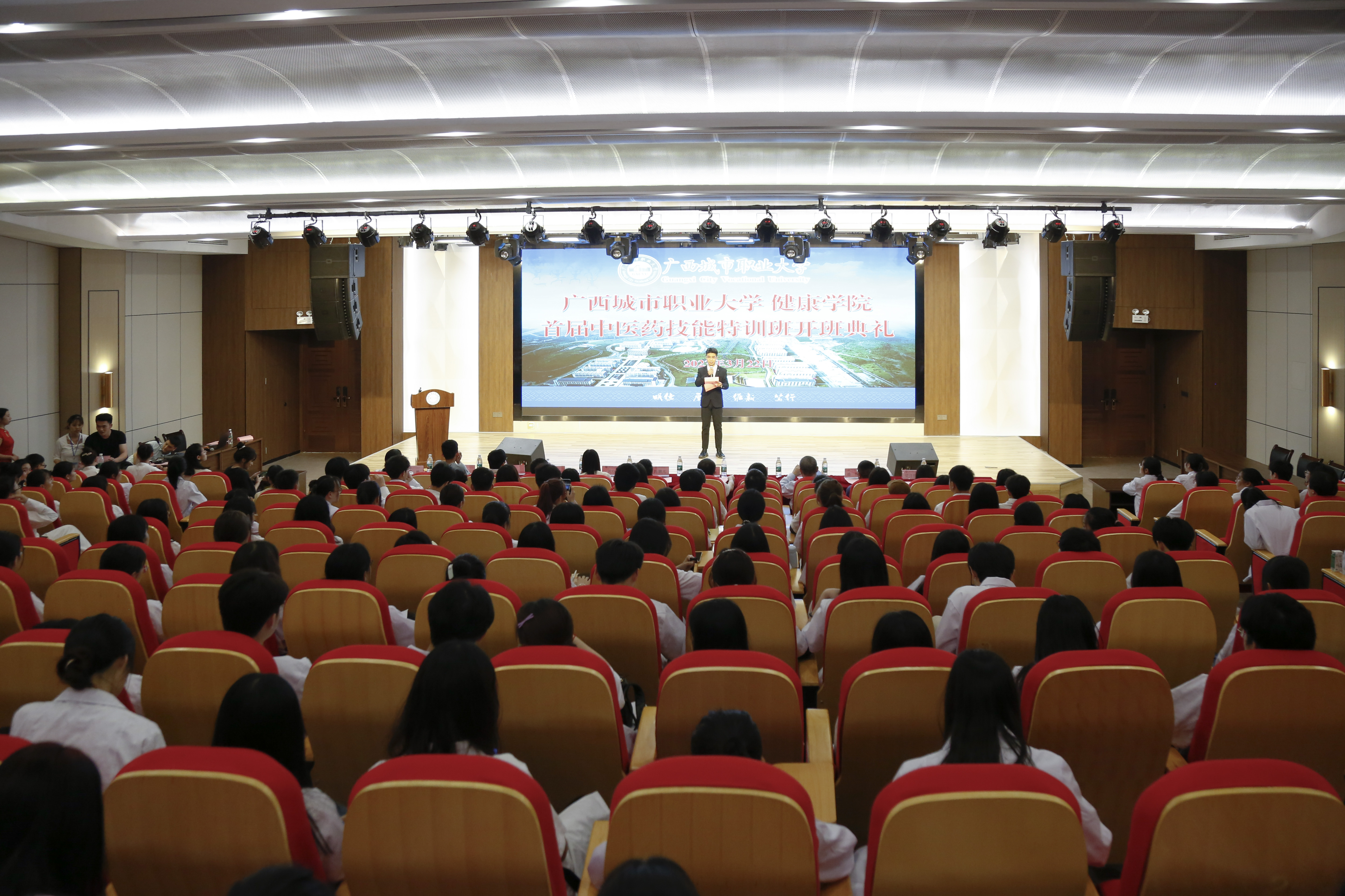 为进一步弘扬中医优秀文化,提升学生团队技术技能水平,打造传承创新技术技能特色团队,3月21日,健康学院于厚学楼阶梯三教室举行首届中医药技能培训开班暨开班典礼。健康学院院长莫中凯、艺术设计与文化传媒学院党总支书记陈鹏光、专业带头人廖海涛教授、健康学院副院长黄玲、继续教育学院副科长梁焕、出席本次活动典礼,健康学院各班学生代表参加典礼。