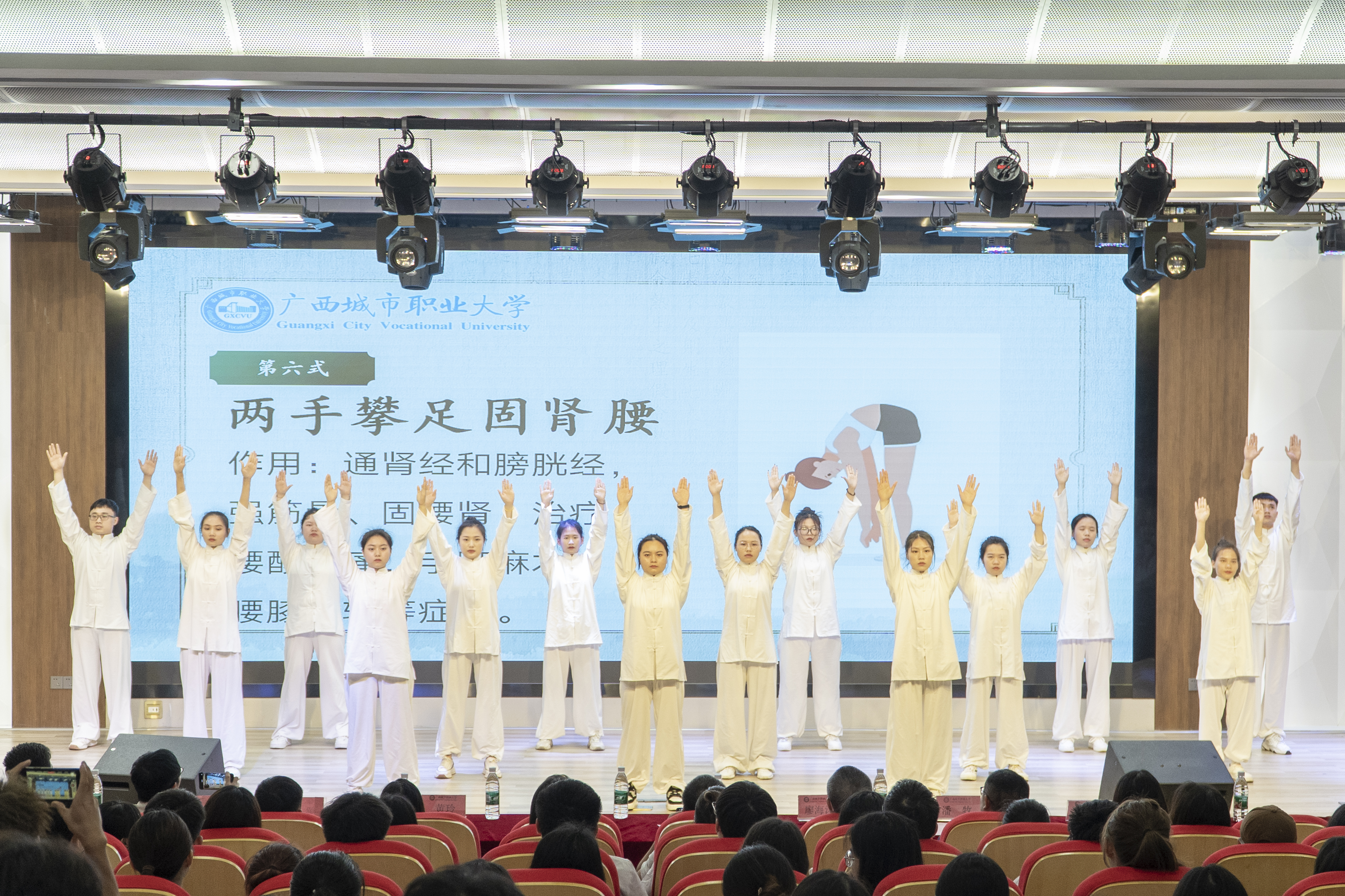 潘沐教授和覃宜欢老师作为本次中医药技能培训负责老师,讲解了本次技能培训的学习内容、学习中医药优秀技能文化的必要。现场培训教师还用八段锦表演、现场互动、技能展示等方式,带领同学们深入了解中医药技能,引导同学们不断增强学习发展的信念。