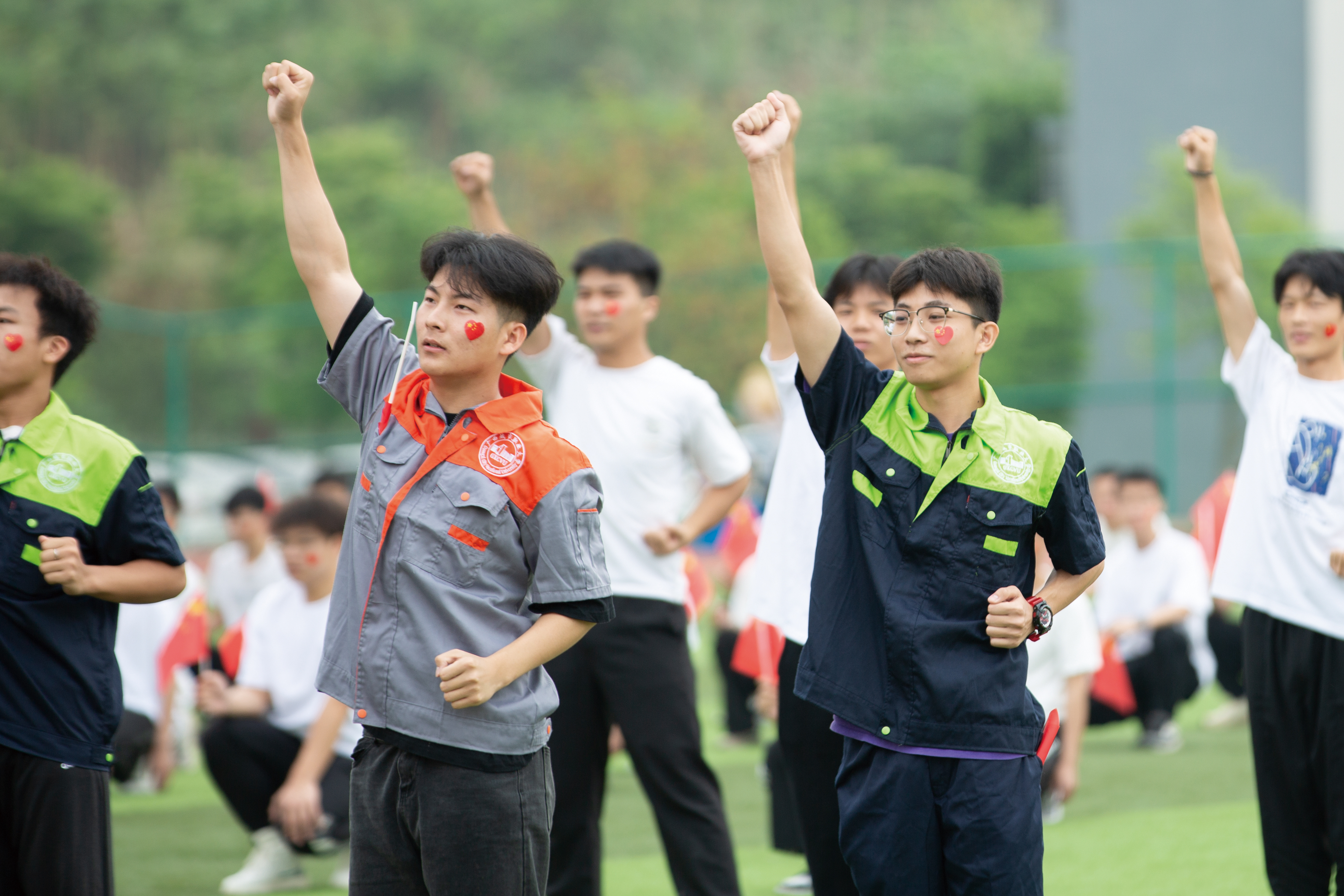 一袭白衣缀蓝色彩球,洋溢着夏日气息的商学院学子用灵动的舞姿引全场沸腾,歌曲《小城夏天》的旋律为闷热的田径场注入清凉;汽车学子身穿实训服,在奔跑中奋力逐梦,做新时代的追梦人;仰止间,信息学子一蓝一白奔赴其中,俏皮的动作,满是童年回忆的《开心超人向前冲》,惹得在场师生喝彩。
