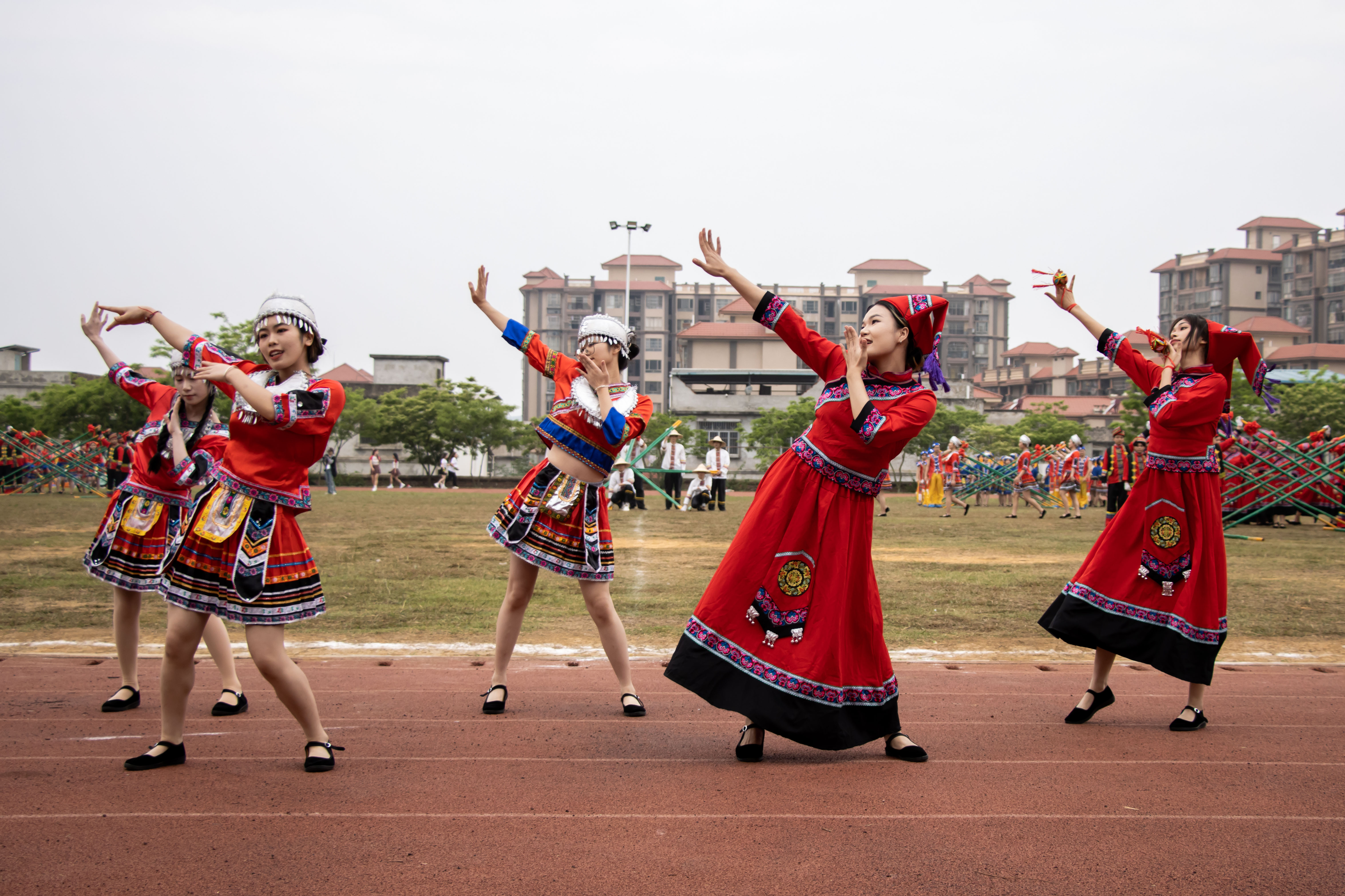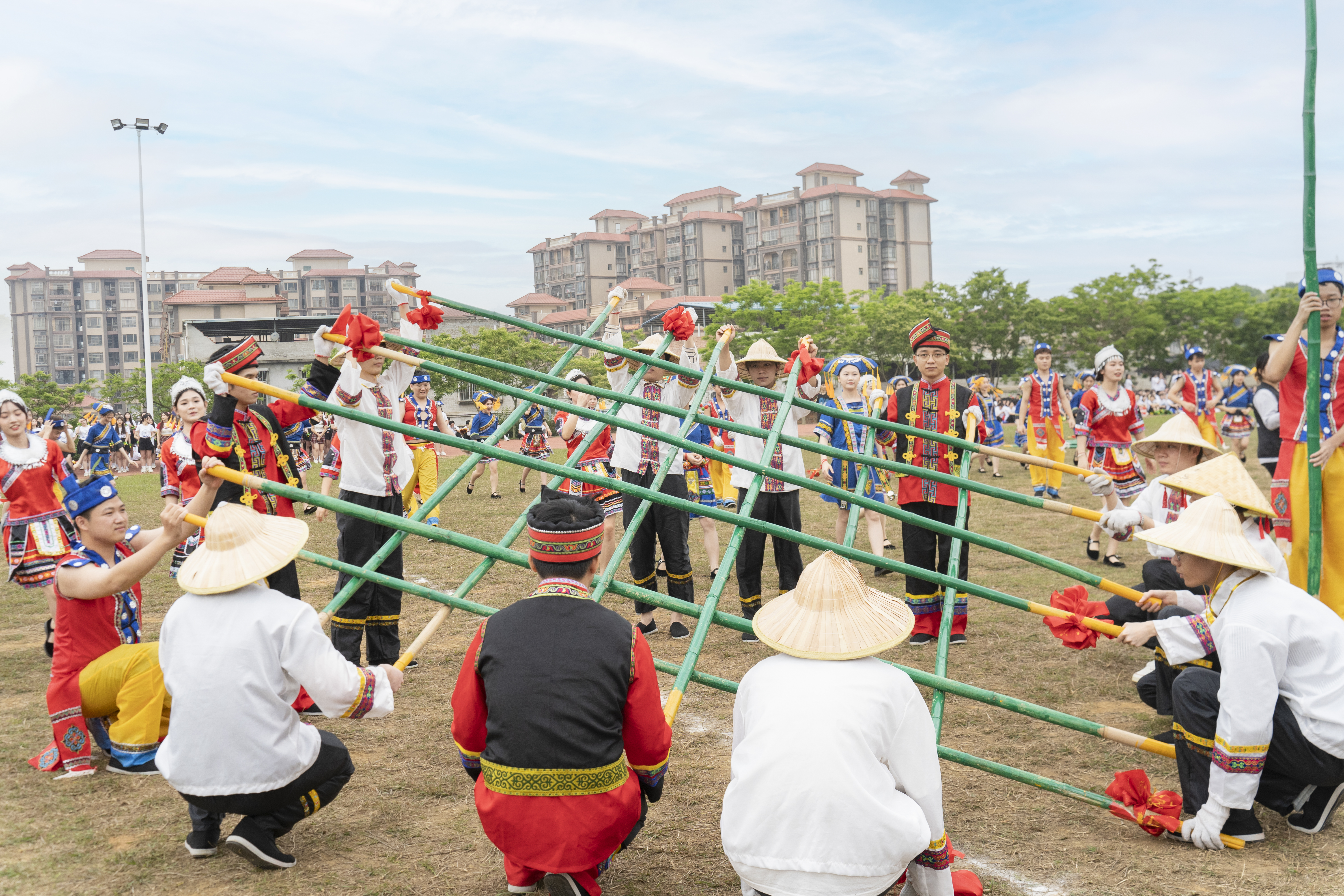 艺术设计与文化传媒学子带来基于民族传统文化改编的文化三部曲,手扶长竹竿,舞动身体,以独特的节奏和动作将《竹竿舞》呈现;抛绣球、曲肘举手、曲膝跺步的《篝火舞》则调动在场师生一同律动;声势浩荡,造型独特《花山岩画》将岩画上的人物形态完美地重现在我们面前。