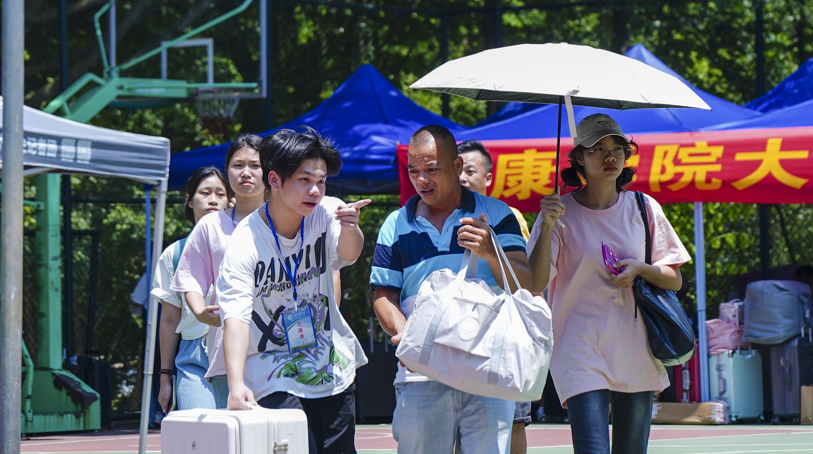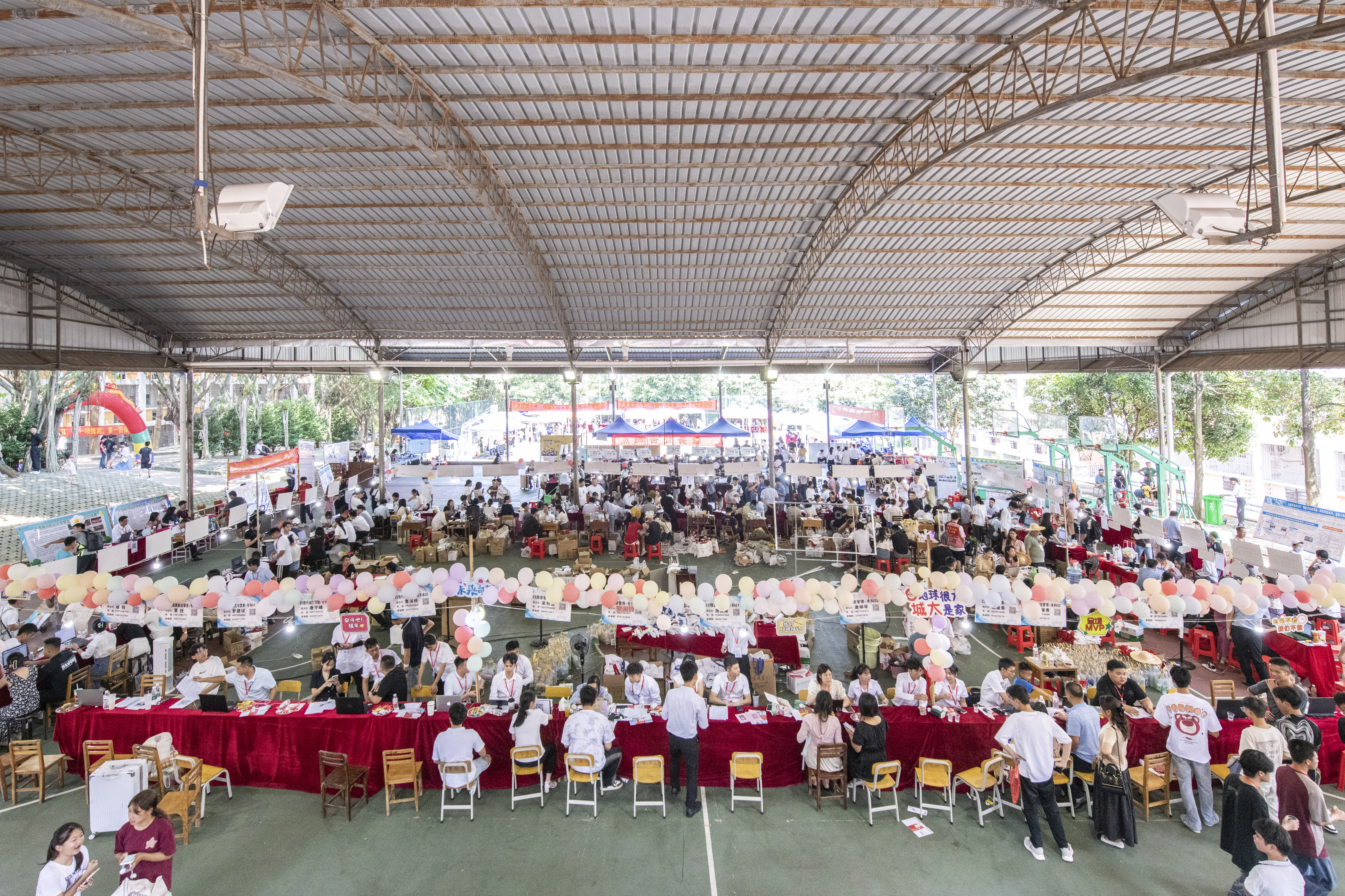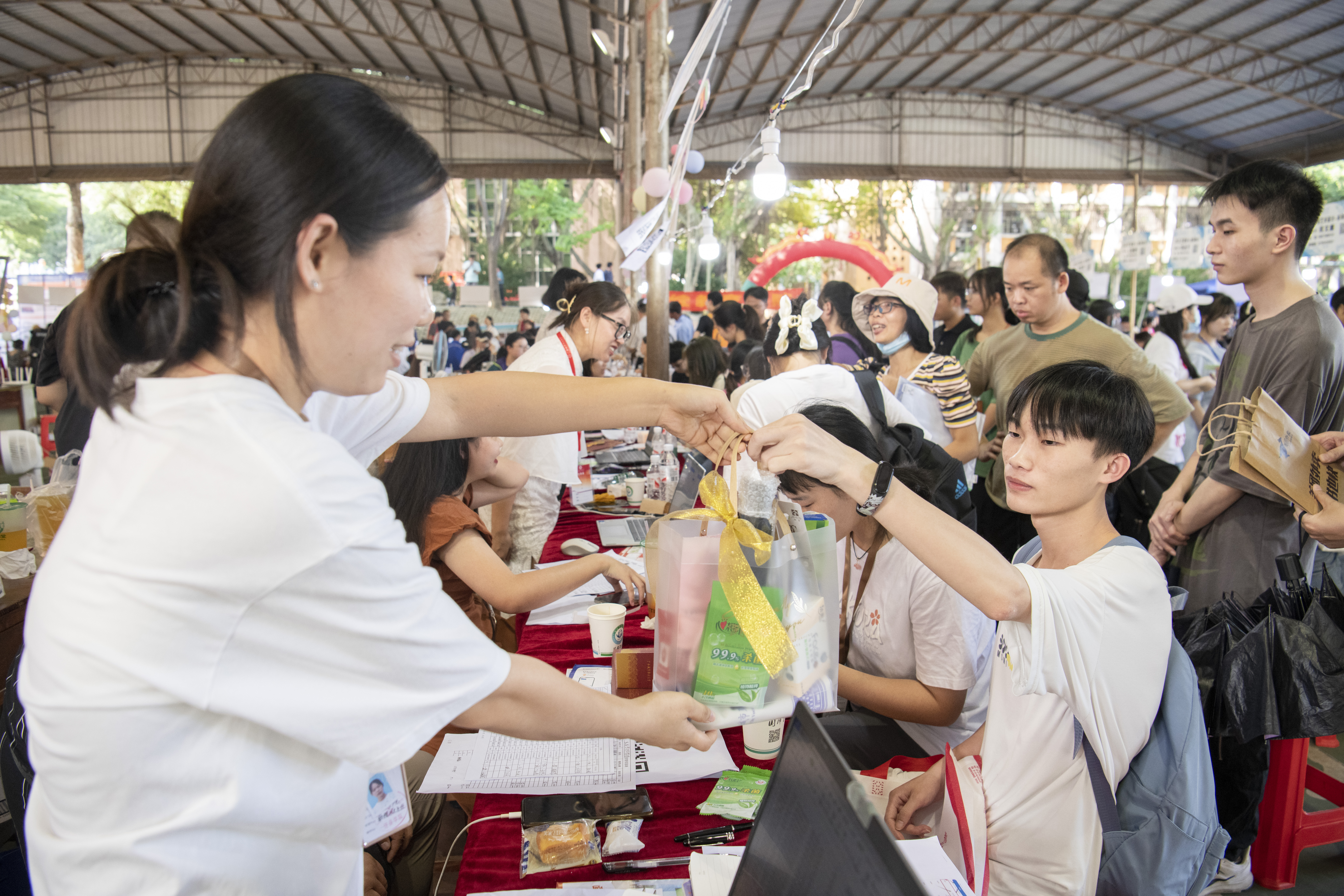 迎新现场,骄阳似火,空港校区灯光球场新生大本营旁篮球场有“打卡抽盲盒”“新生红包墙活动”等迎新活动,新生们凭借录取通知书参与活动,现场互动十分火热。