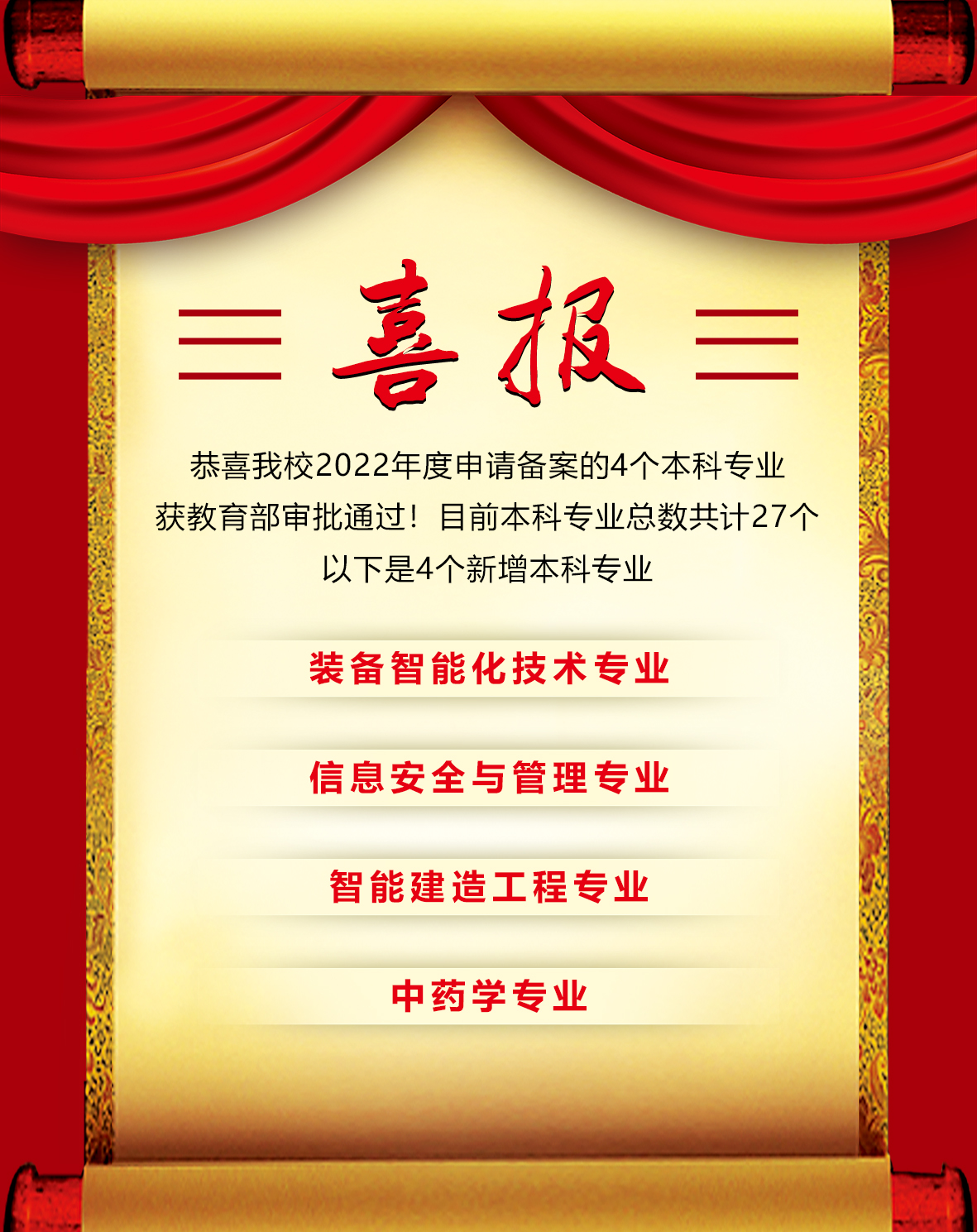 近日,教育部办公厅发布《教育部办公厅关于公布2023年本科层次职业教育拟招生专业设置备案结果的通知》(教职成厅函﹝16﹞号),我校2022年度申请备案的“装备智能化技术”“信息安全与管理”“智能建造工程”“中药学”四个职业本科专业获教育部审批通过,截至目前,我校本科专业总数共27个。