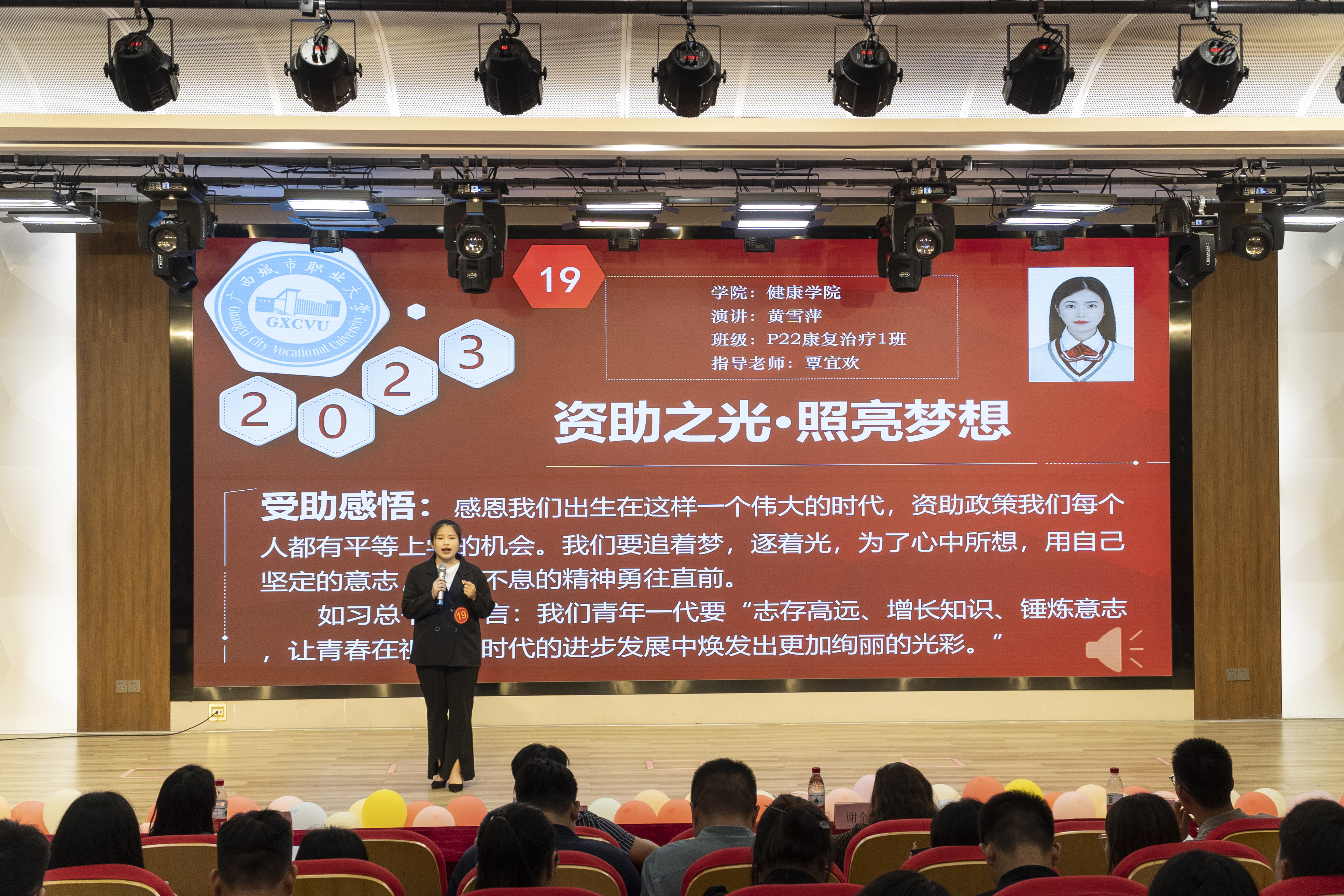 “我们要追着梦,逐着光,为了心中所想,用自己坚定的意志,自强不息的精神勇往直前……”黄雪萍同学饱含热情与真诚的演讲赢得在场观众的热烈掌声。