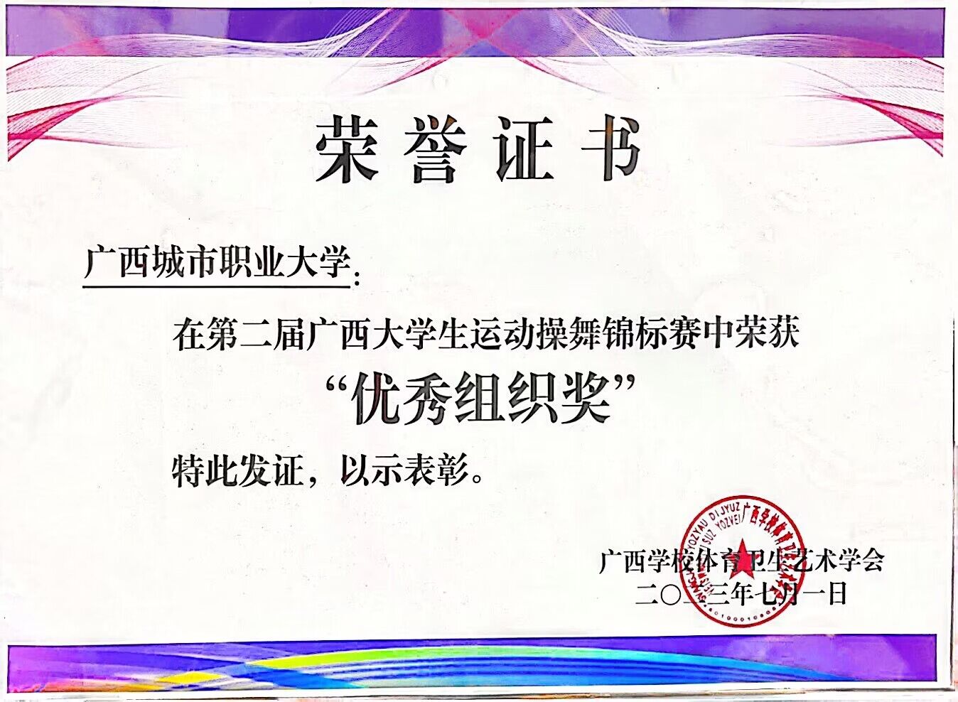 7月1日,第二届广西壮族自治区大学生运动操舞锦标赛在桂林市拉开序幕,我校参赛学子在民族民间舞赛项中荣获第一名,并获“优秀组织奖”称号。