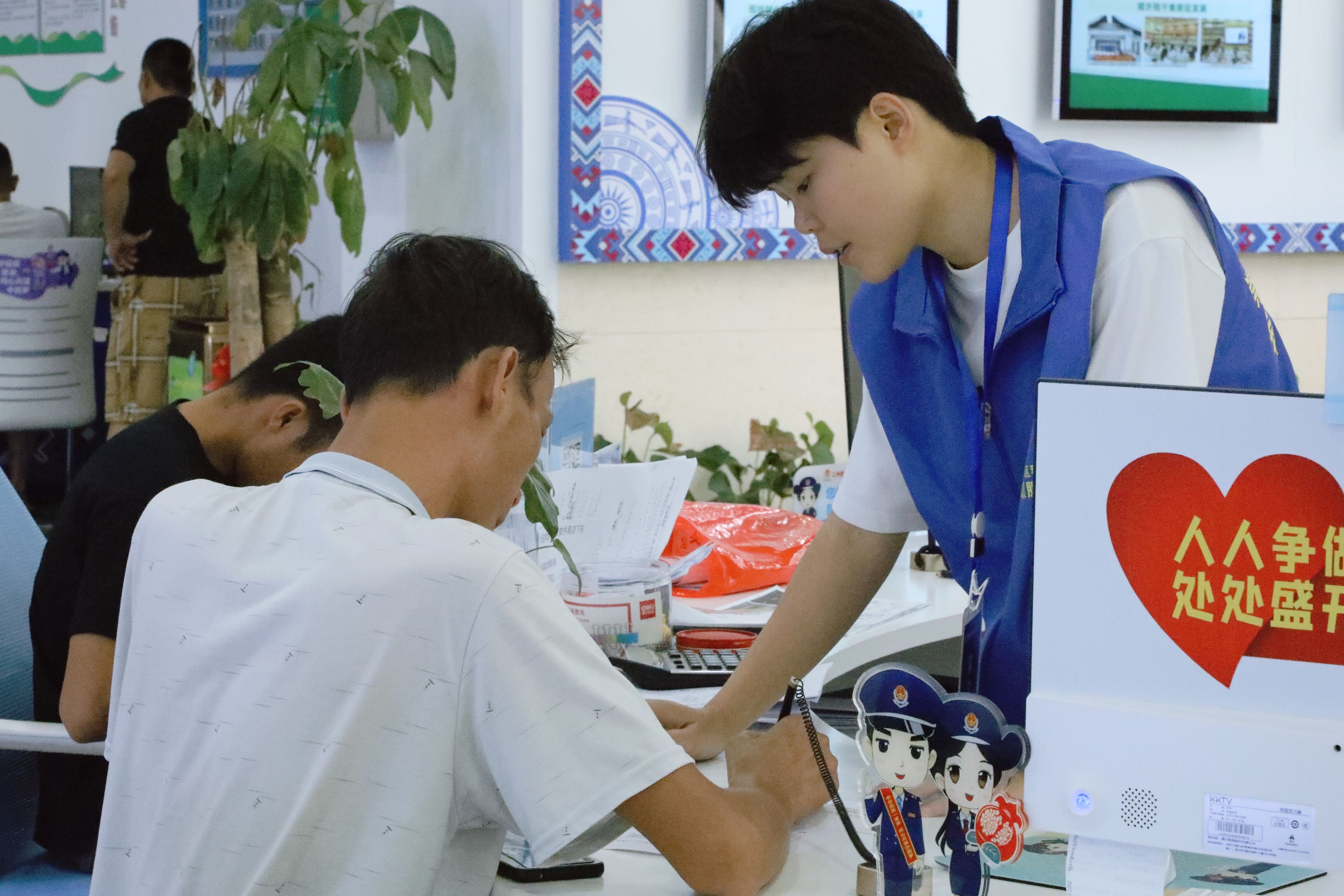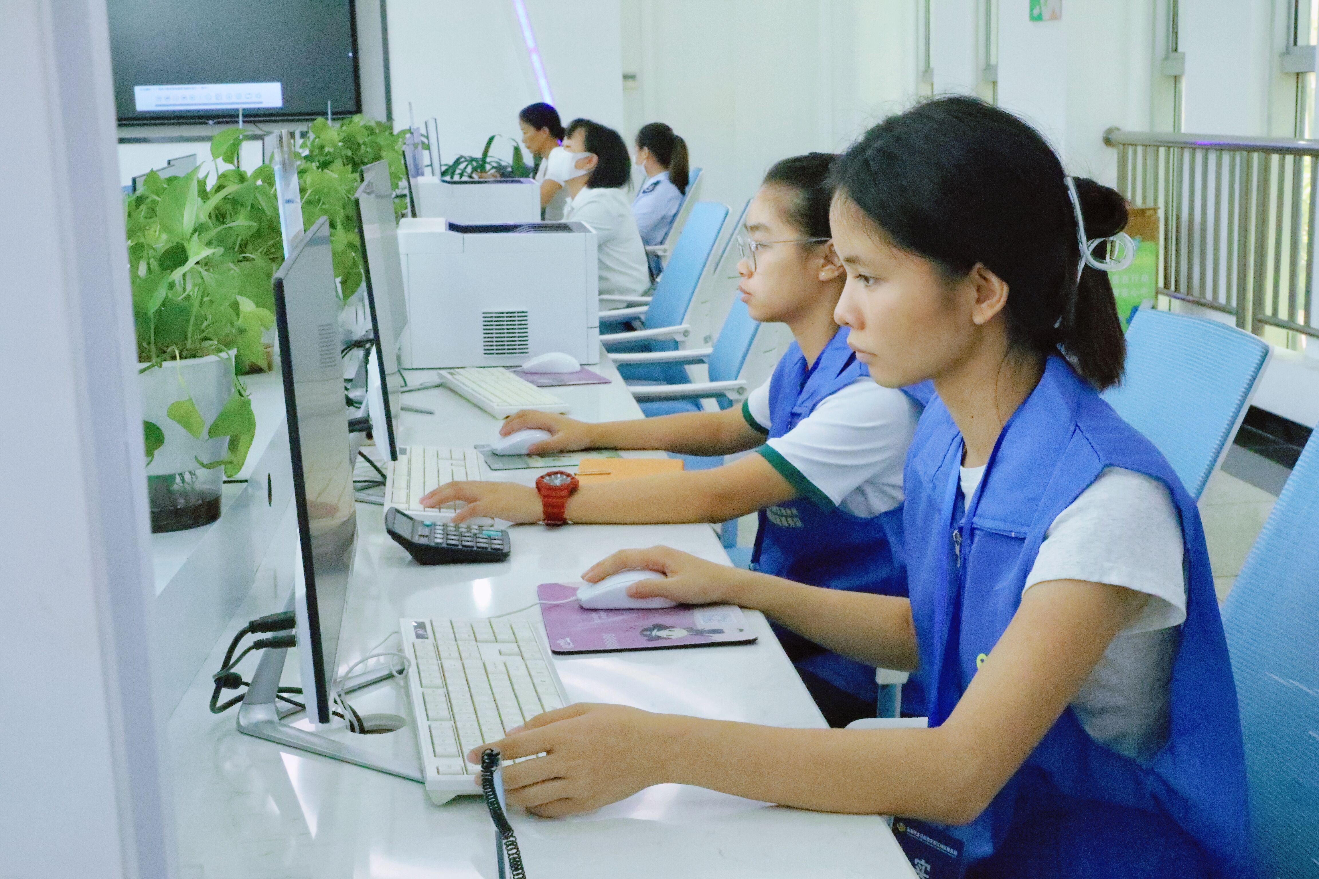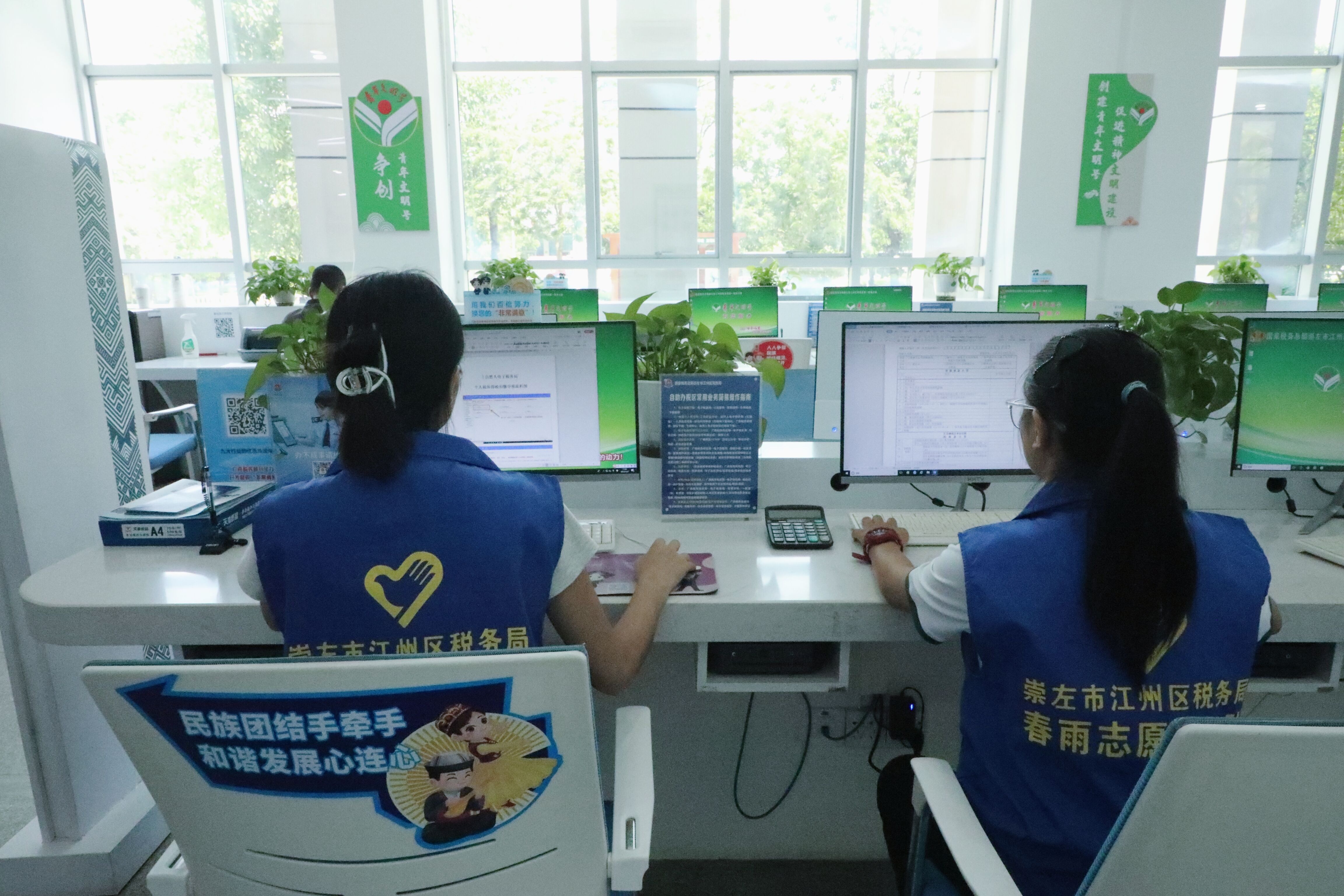 在崇左市江州区税务局服务厅,商学院学生志愿者现场就群众普遍关注的“社保费”“个人所得税”“房产交易”等热点问题进行答疑,帮助群众使用自助办税终端、手机等工具快速进行业务办理。