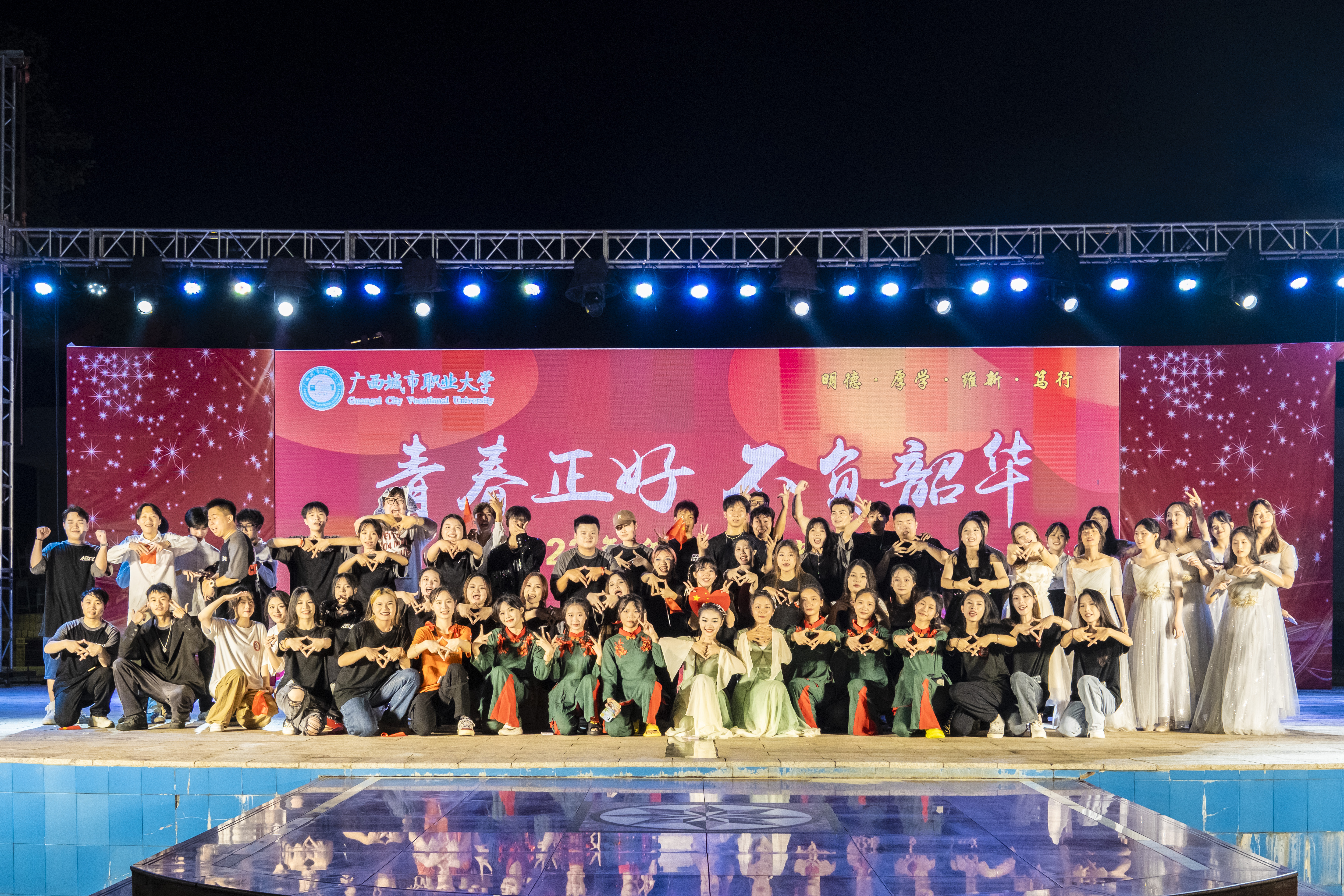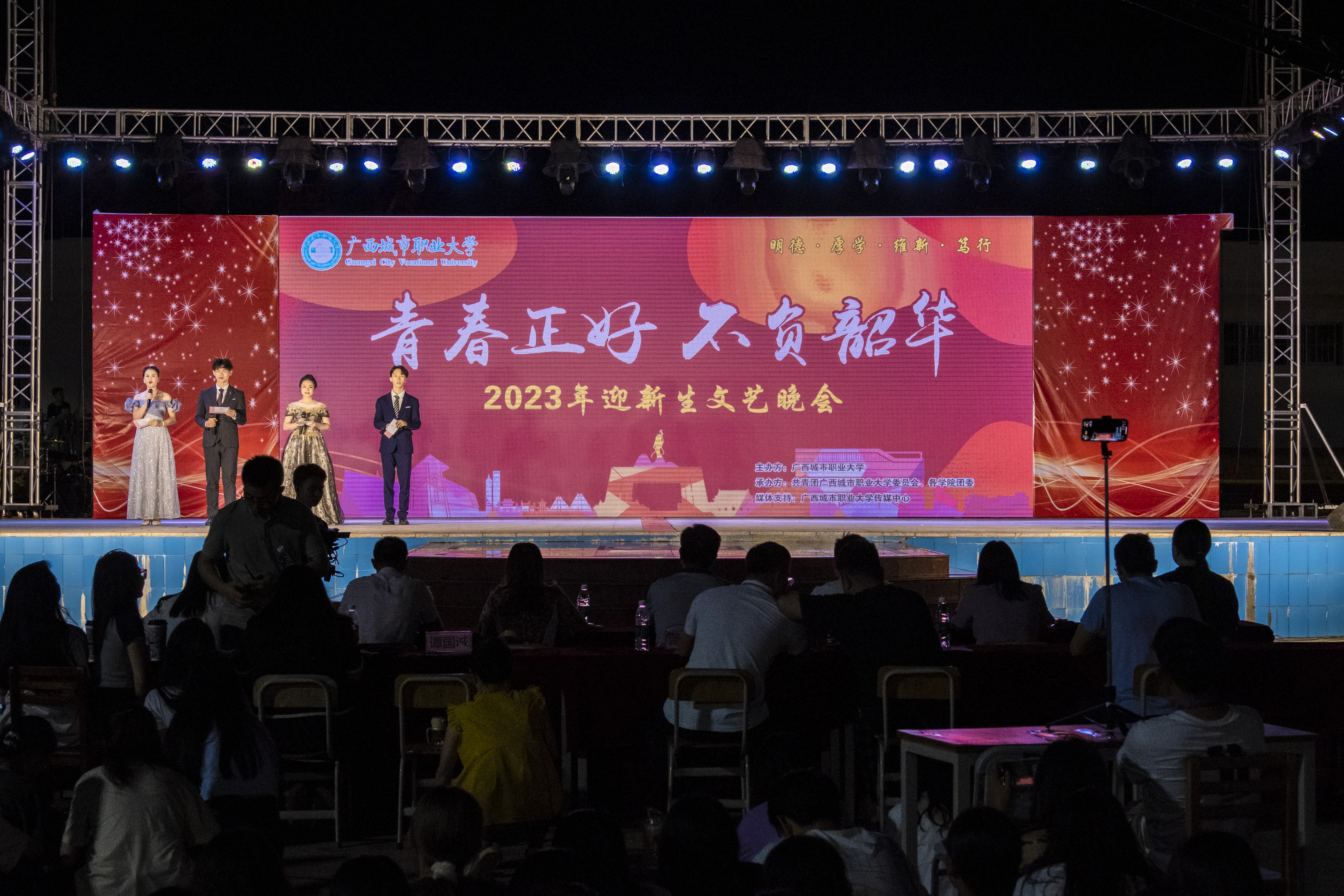 9月16日晚,我校在空港校区万物生涧源、崇左校区露天舞台隆重举行2023年“青春正好 不负韶华”主题迎新晚会。党委书记伍鹏志、校长李中华等领导老师出席晚会,2023级全体新生参加晚会。